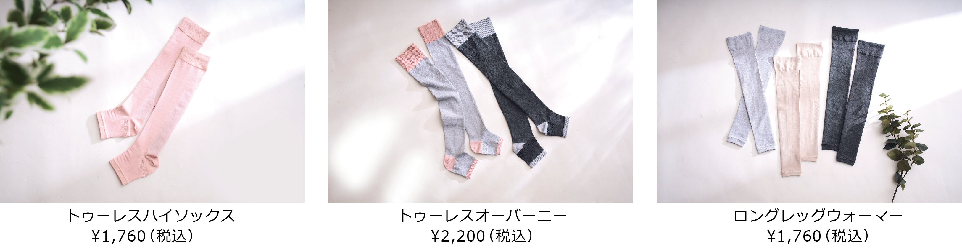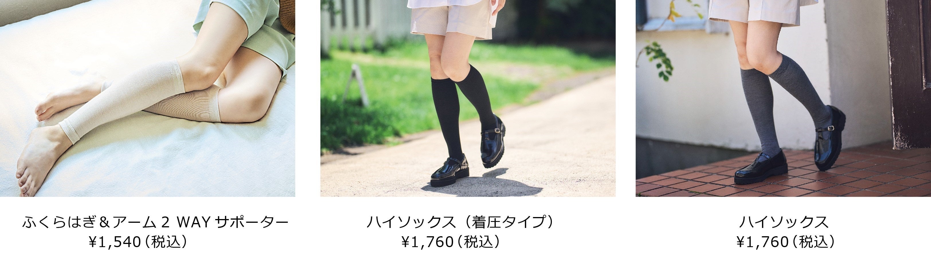 商品ラインナップは、締め付けずゆったり履ける着圧とは異なる履き心地の「トゥーレスハイソックス」、太ももまでふんわり締め付けない「トゥーレスオーバーニー」、ふくらはぎ、腕に、便利な2WAY仕様「2WAYサポーター」、かさつきが気になるひざ上までカバー「ロングレッグウォーマー」、お家でも外でも使える「着圧ソックス」など豊富なバリエーションをご用意しております。
