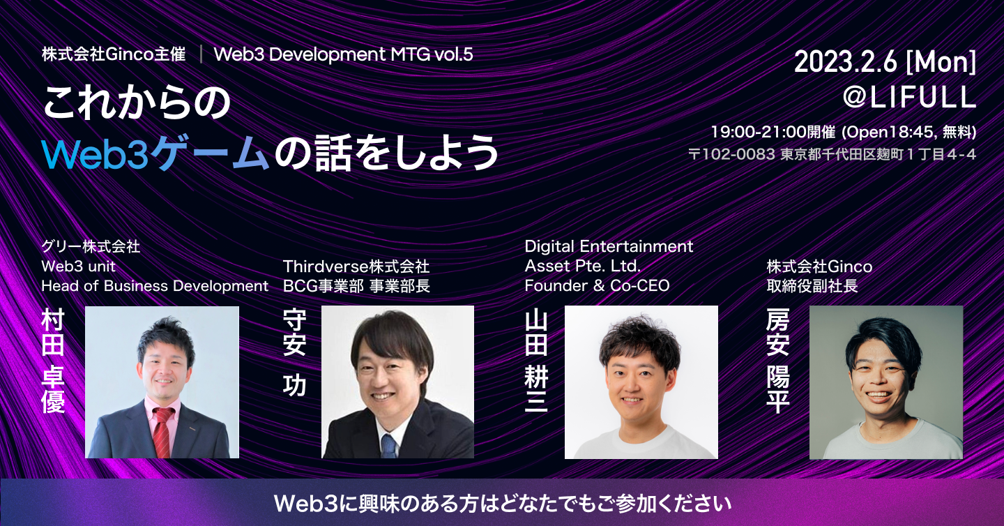 開催第5回目となる今回は、「Web3ゲームの話をしよう」と題し、ゲーム領域からWeb3事業に切り込む有識者として、グリー株式会社 村田卓優氏、株式会社Thirdverse 守安功氏、Digital Entertainment Asset Pte. Ltd. 山田耕三氏の3名を迎え、ディスカッションを行います。