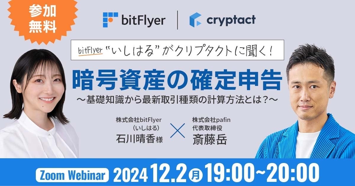 暗号資産(仮想通貨)の自動損益計算サービス「クリプタクト」を運営する株式会社pafin(共同代表取締役 アズム・デアミン/斎藤岳、以下「pafin」)は、国内主要取引所であるbitFlyer、OKJ、GMOコイン各社と連携し、確定申告に向けたウェビナーを開催いたします。セミナーでは、各取引所の最新情報を紹介し、投資家がより簡便に確定申告手続きを行えるようサポートします。