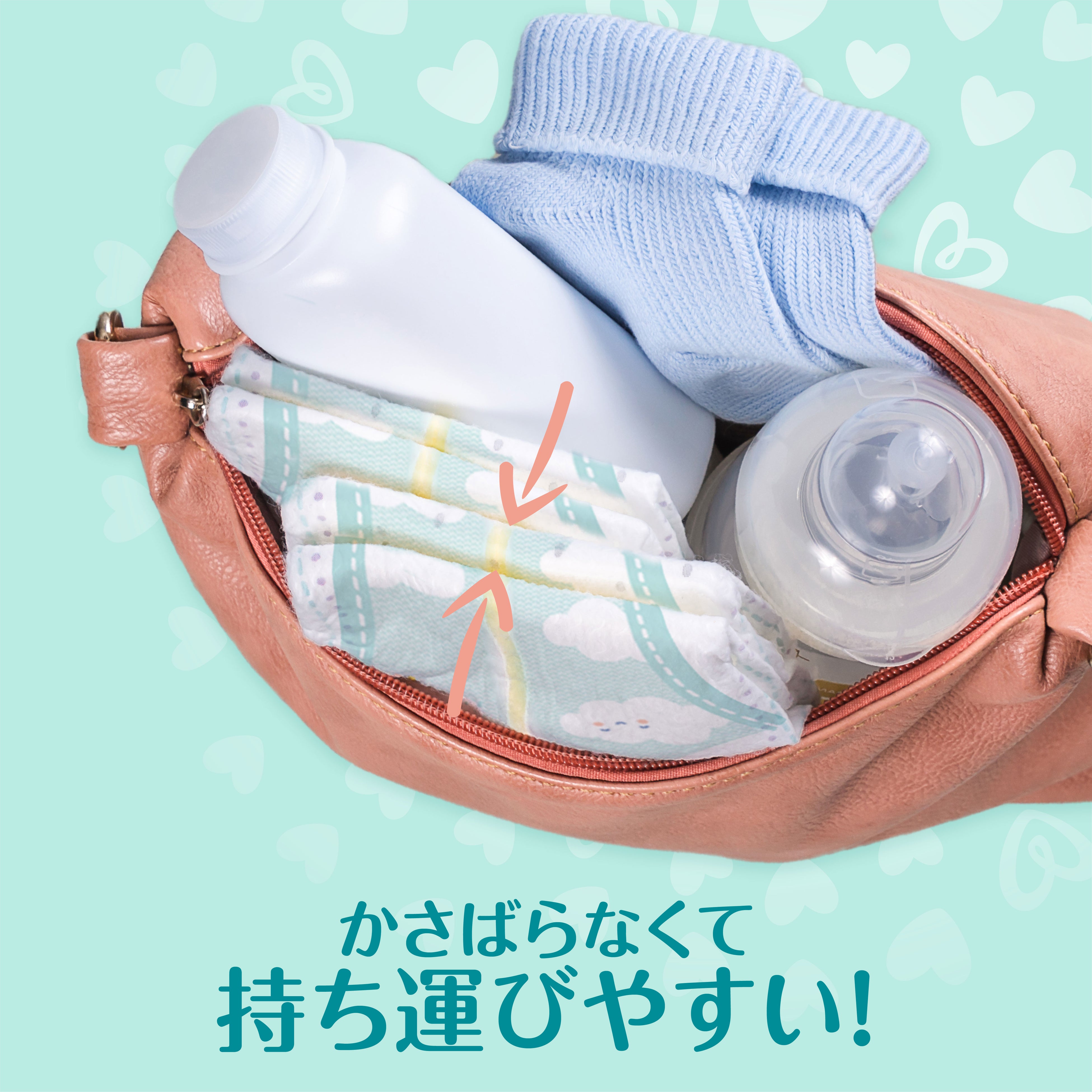 2つの機能を1枚に合体させた新素材の採用で、従来品と比較して20%も薄くなりました。さらに吸収力も向上したことで、「薄さ」と「超吸収」の両立が実現。吸水後ももこもこしにくく、どんなお洋服にも合って、赤ちゃんにとっても動きやすいおむつです。かさばらないので、お出かけの際の持ち運びも便利です。