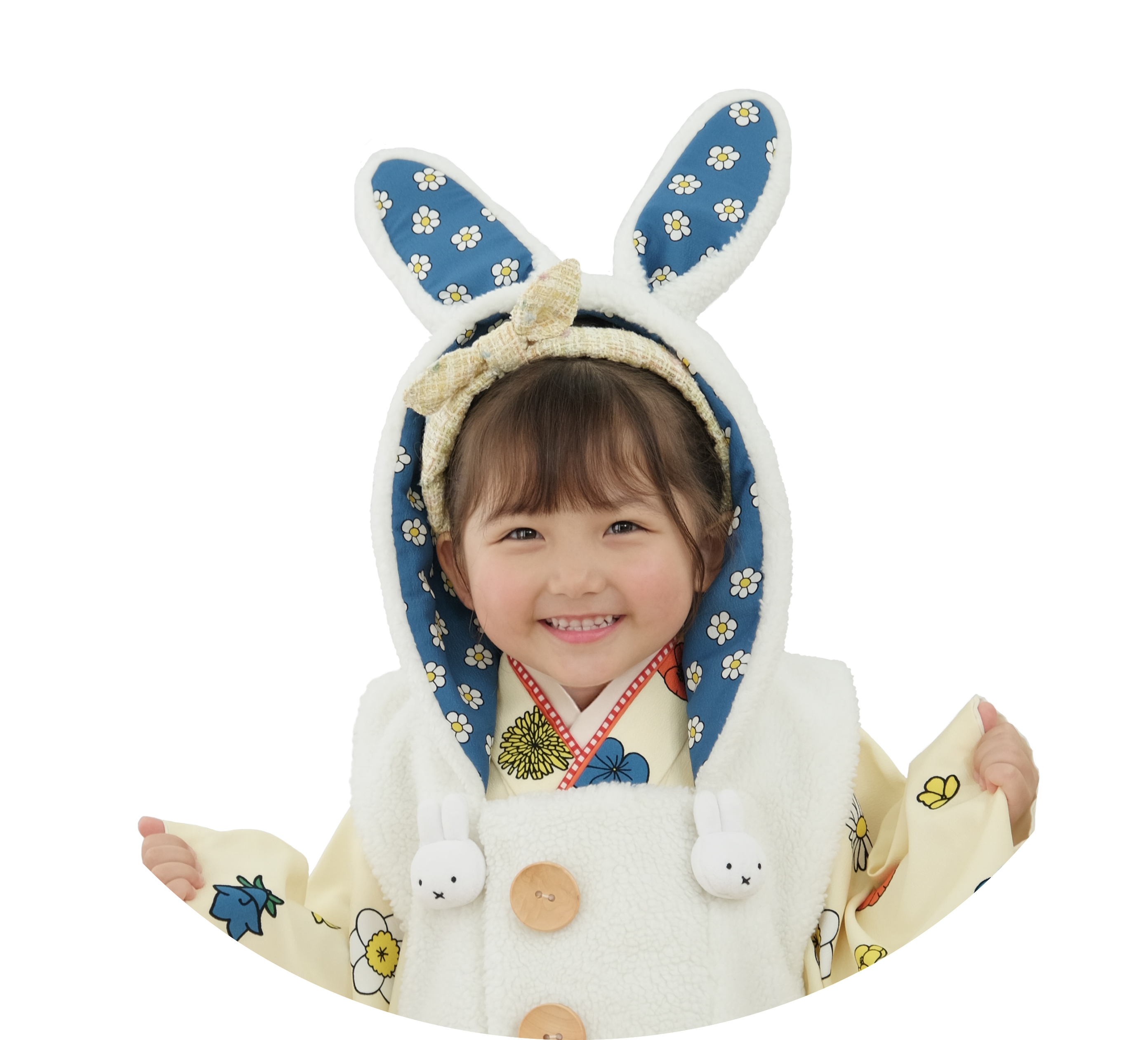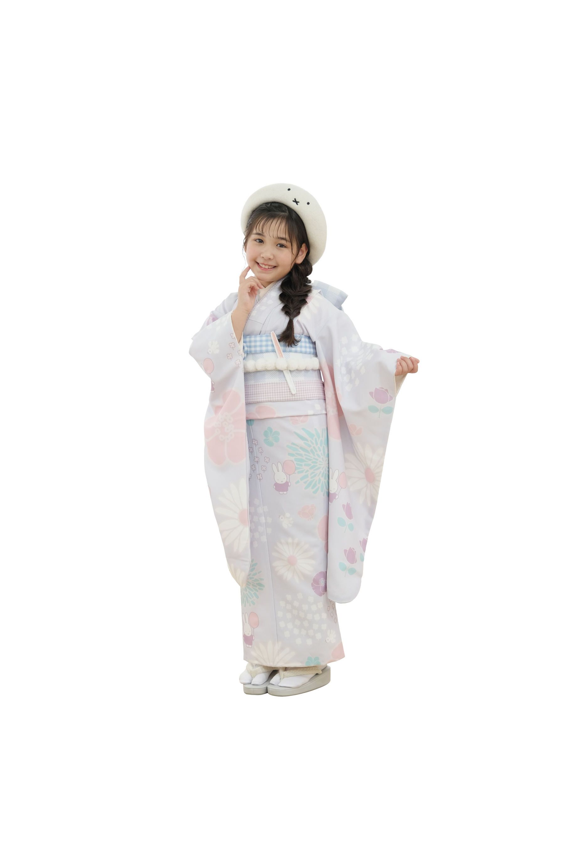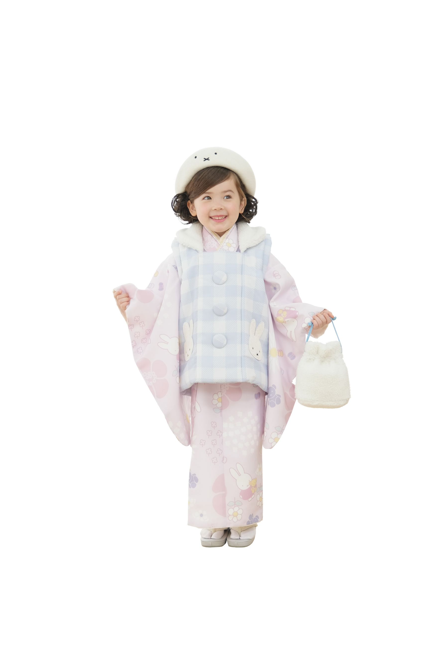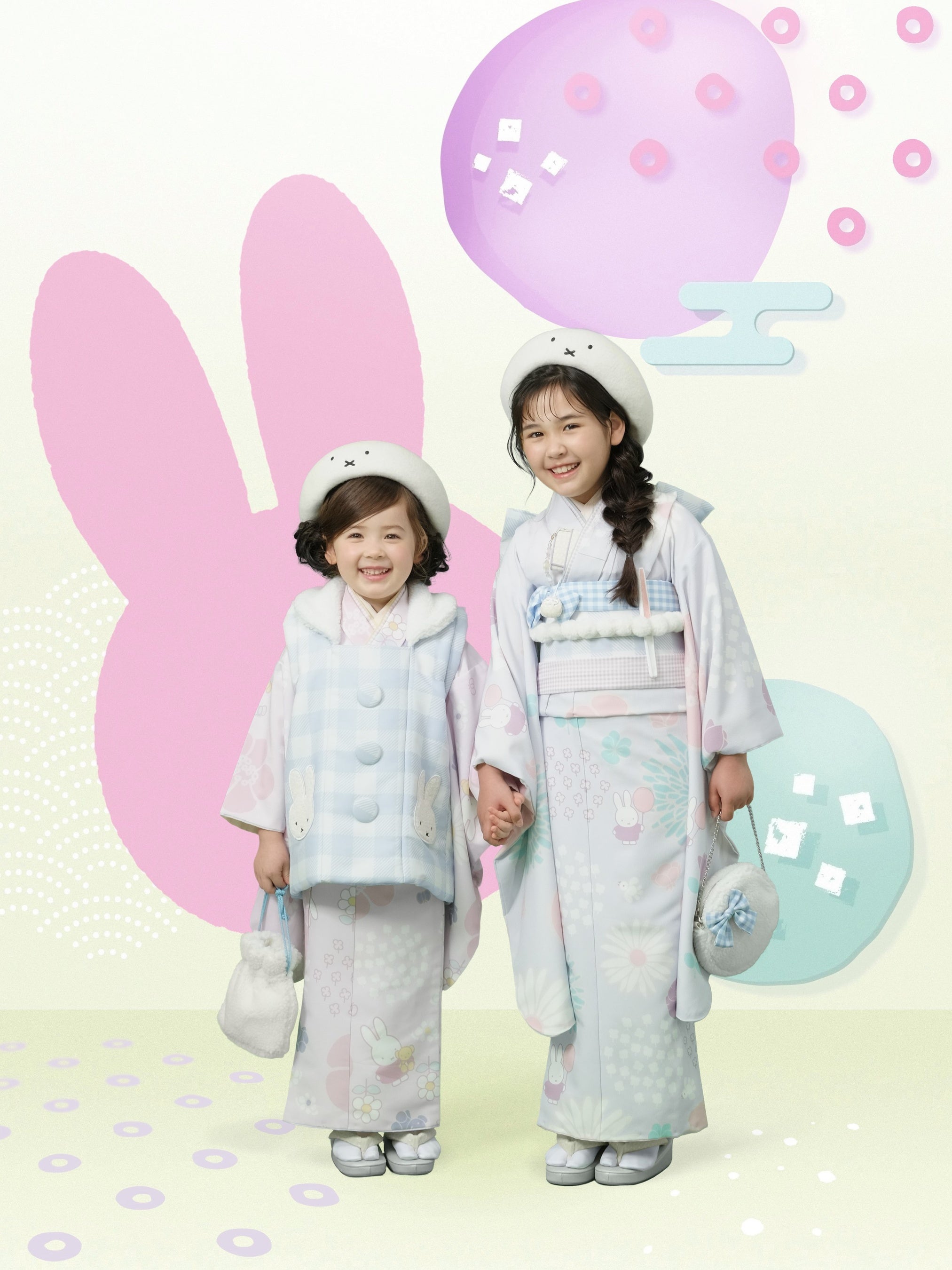 「ミッフィー」和装は、ブルーナカラーと、お子さまに人気のパステル系デザインの2種を被布と四つ身の計4種ご用意しています。姉妹でリンクコーデがお楽しみいただけるかわいいデザインです。