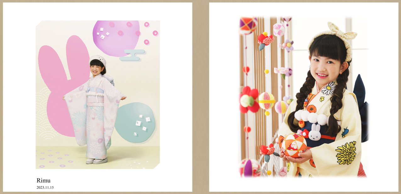 「ミッフィー」専用背景は、和柄と組み合わせたブルーナカラーと、優しい色合いのパステルカラーの2種のデザインをご用意しています。ブルーナカラーの背景は、「ミッフィー」が一緒に七五三をお祝いしているシーンをイメージしており、ブルーナカラーが着物を引き立てます。また、優しいパステルカラーの背景は、女の子が大好きな温かみのあるデザインです。