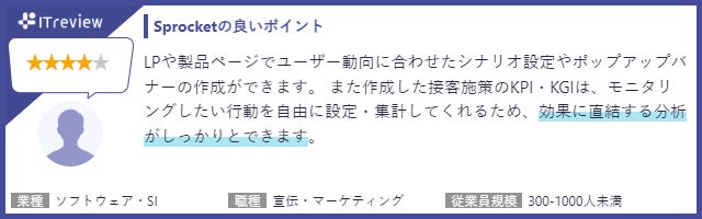 「機能面ではシナリオ分岐があるため、より丁寧なご案内ができる」「コンサルティングの方に企画提案から設計・公開・検証・再提案までお任せしているので、接客ツールを自社サイトに取り込むことができた」「管理画面上でのABテスト結果もシンプルで分かりやすい」などの評価をいただいております。