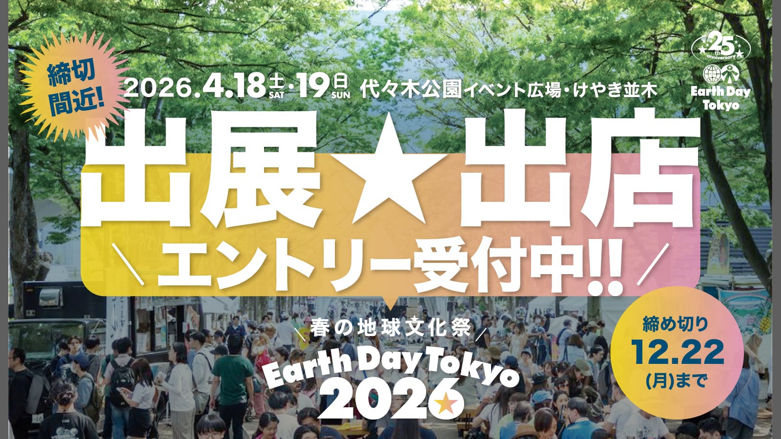 一般社団法人アースデイ東京では、4月18日(土)・19日(日)代々木公園(渋谷区)で開催の「アースデイ東京2026」に出展したい団体のエントリーを受付中です。締切は2025年12月22日まで。