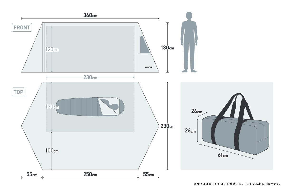 製品サイズ(展開時) | アウターテント:約)幅360cm×奥行230cm×高さ130cm インナーテント:約)幅230cm×奥行130cm×高さ120cm |