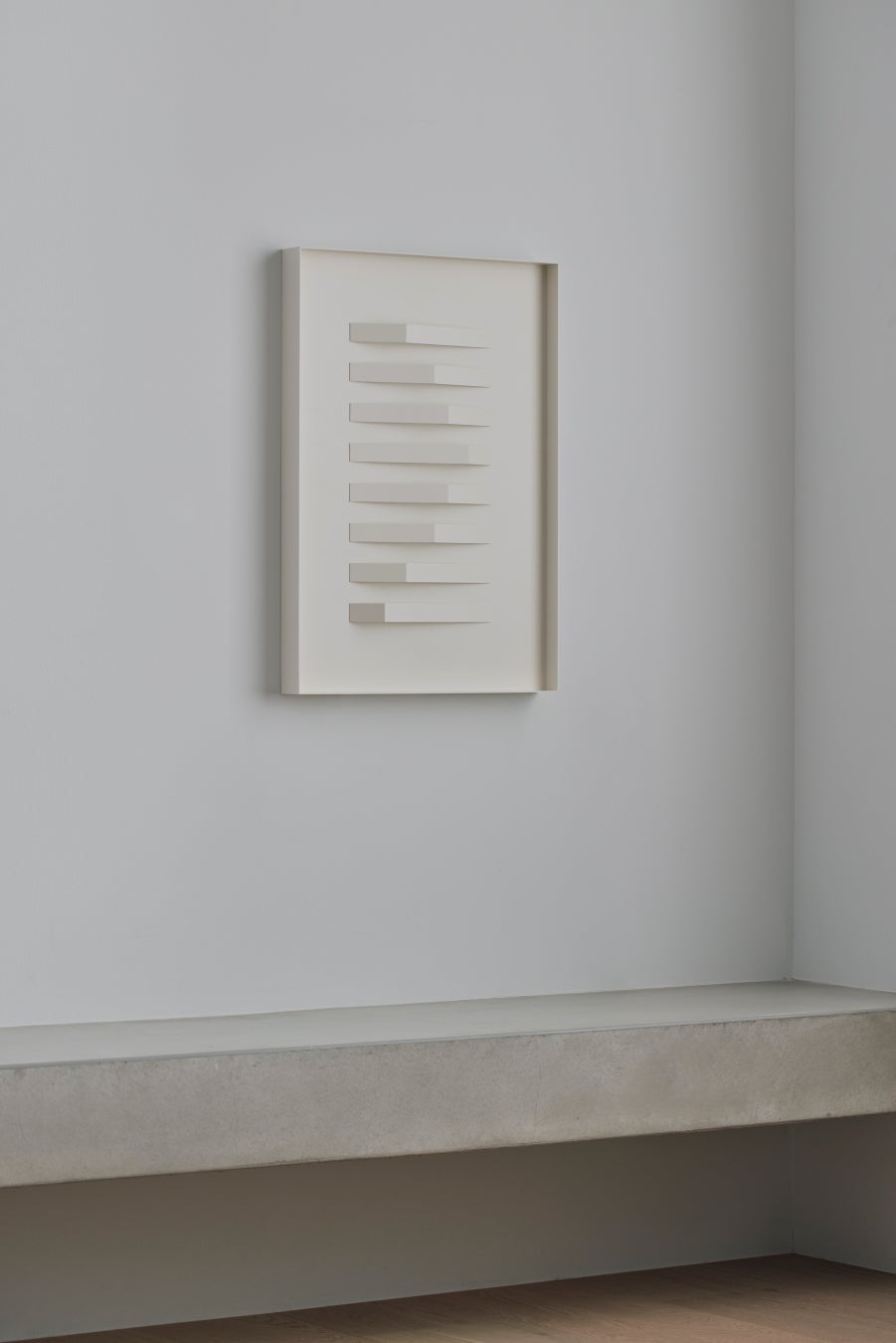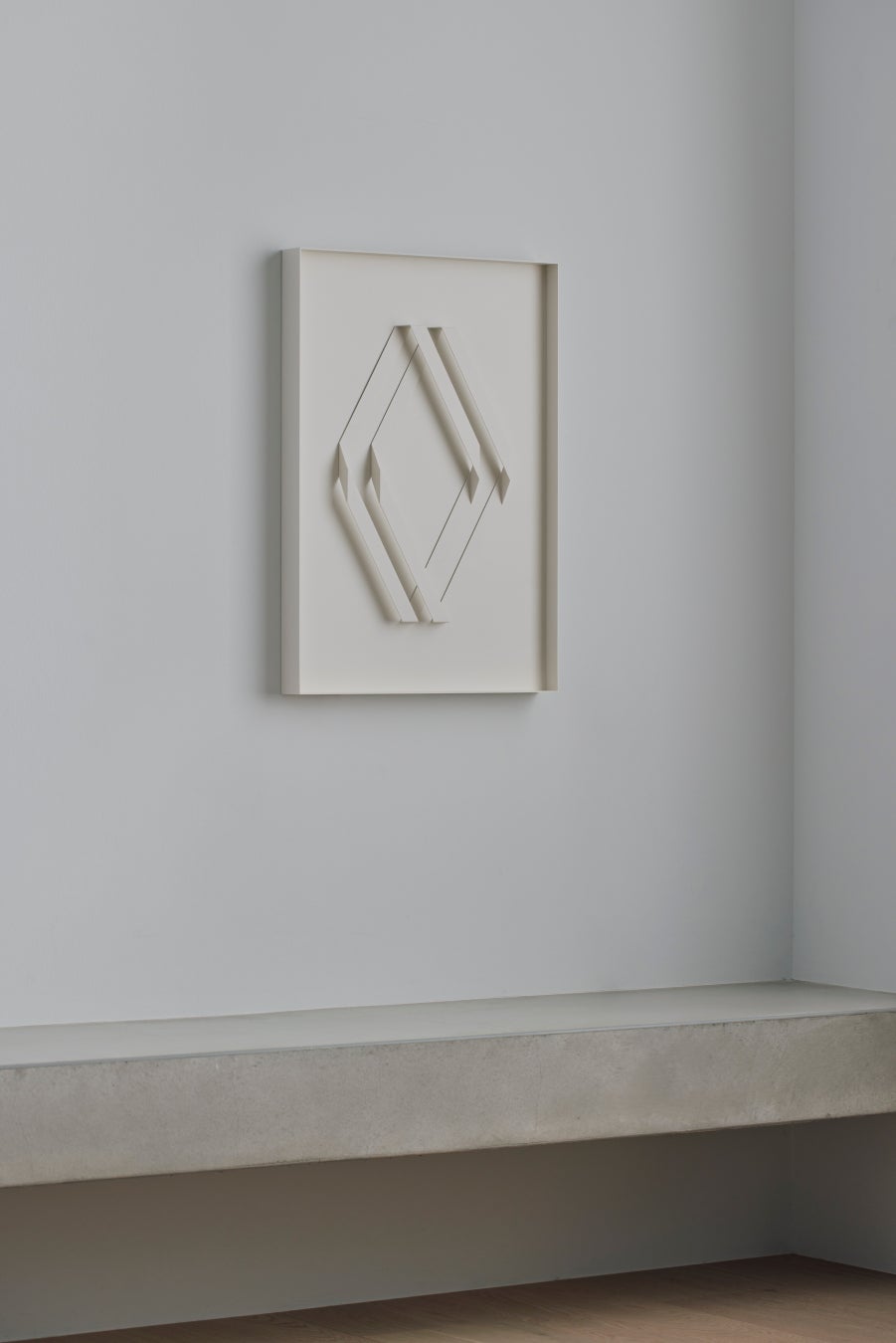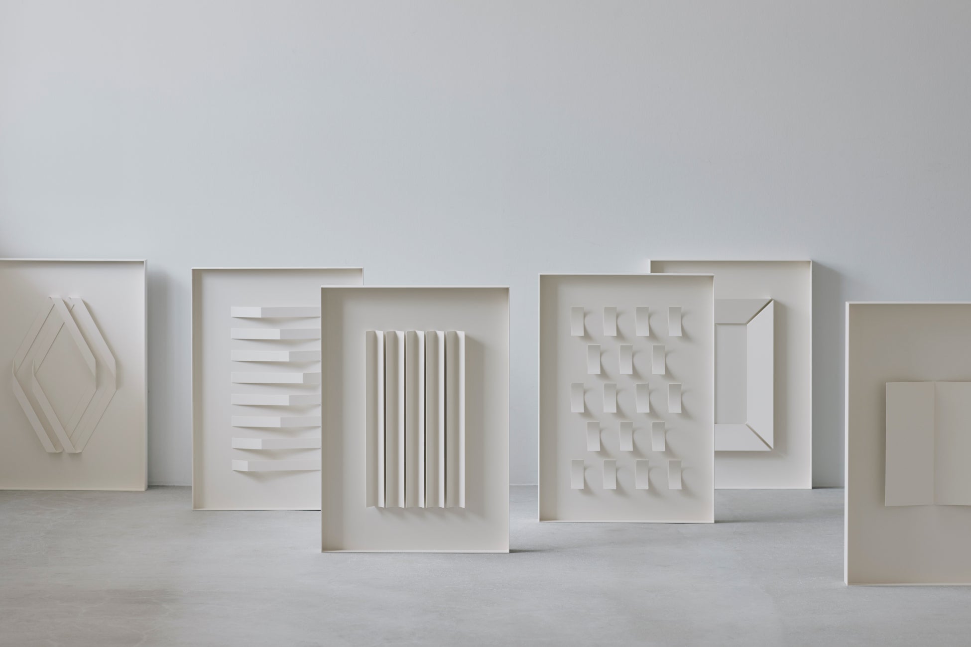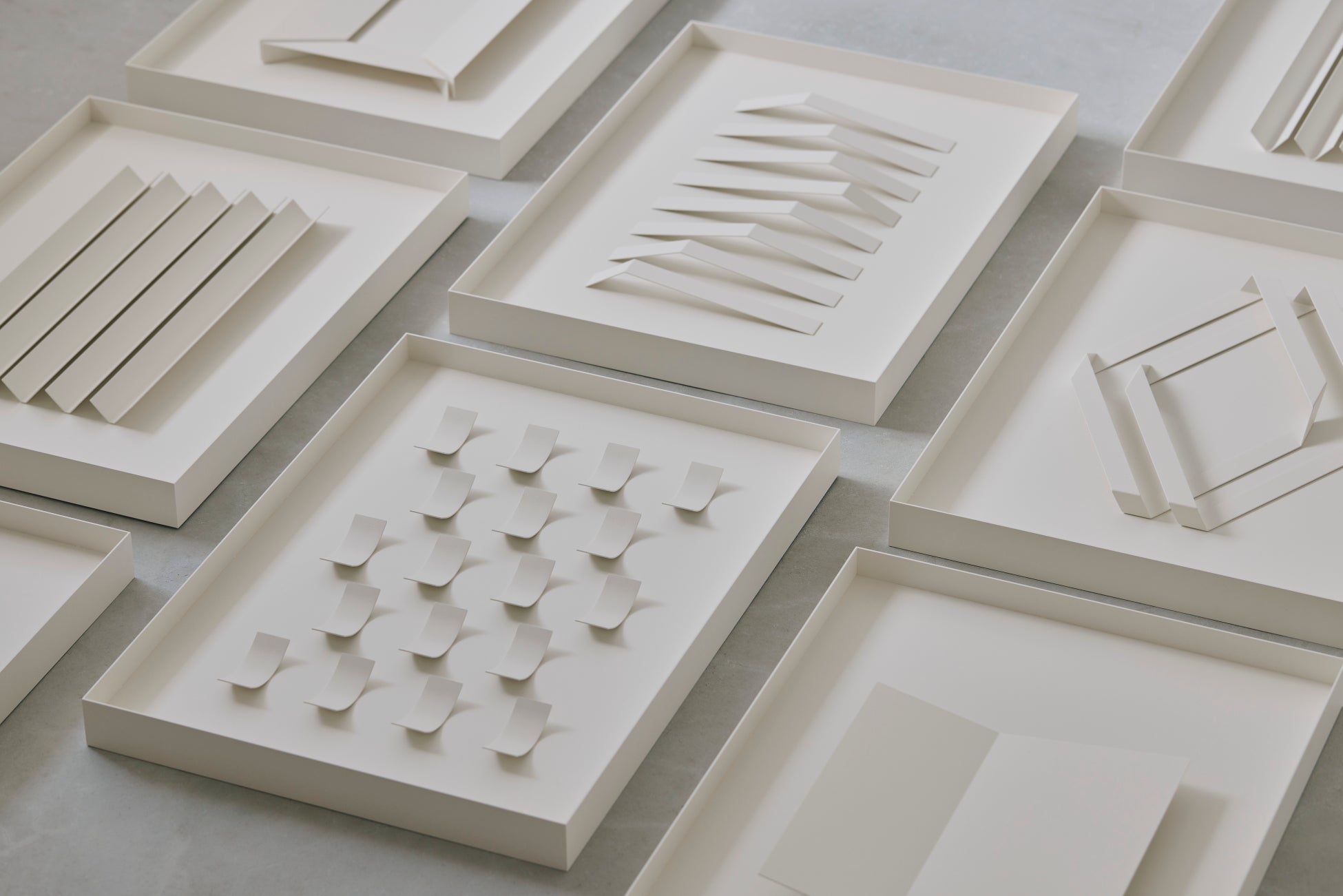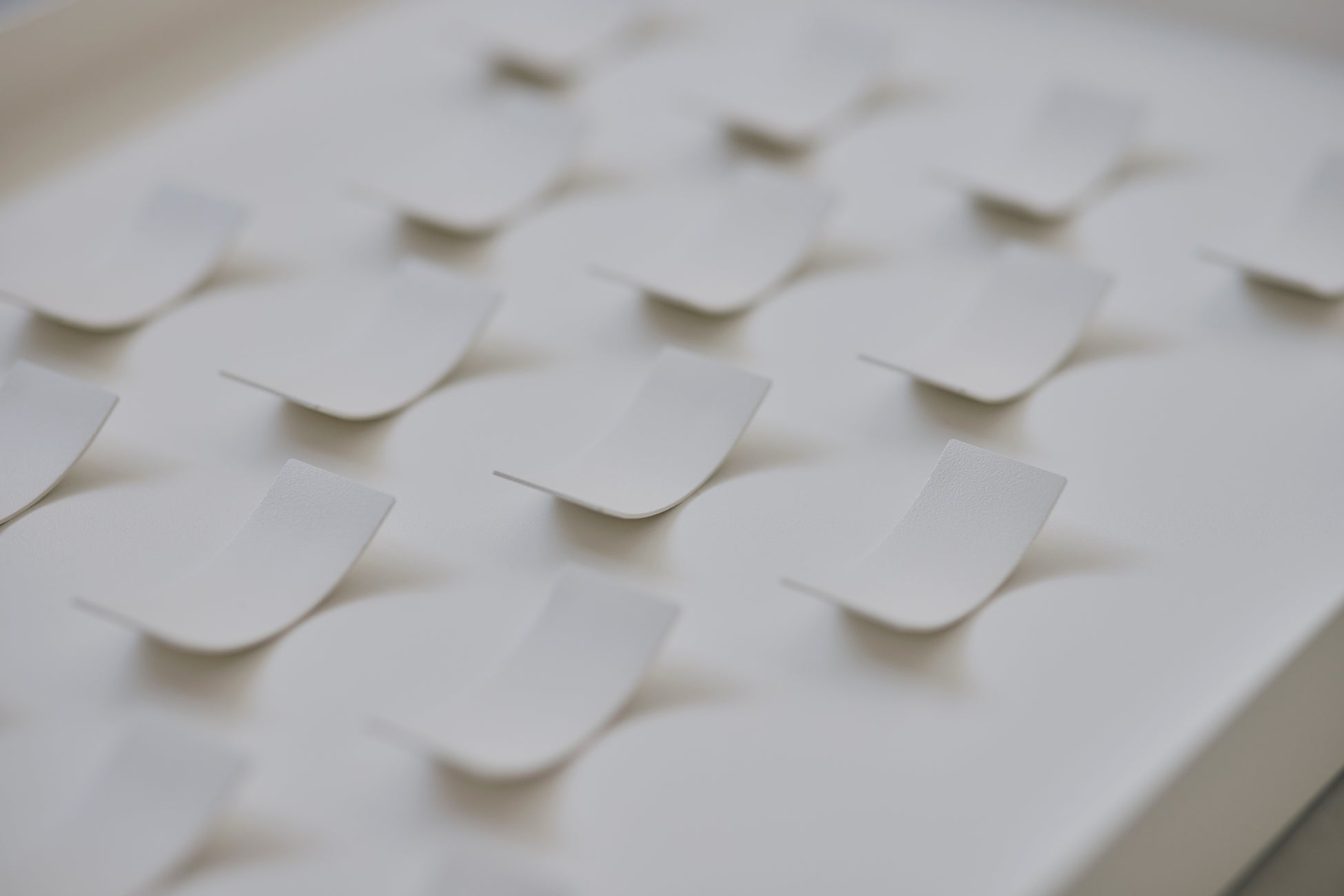 「Moment(モメント)」は、およそ1㎜の薄いスチールを折り曲げてつくったオブジェです。紙をテーブルにそっと置いた瞬間の浮遊しているような軽やかさと、幾何学的な造形から生まれる陰影が、空間の中で凛とした佇まいを生み出します。