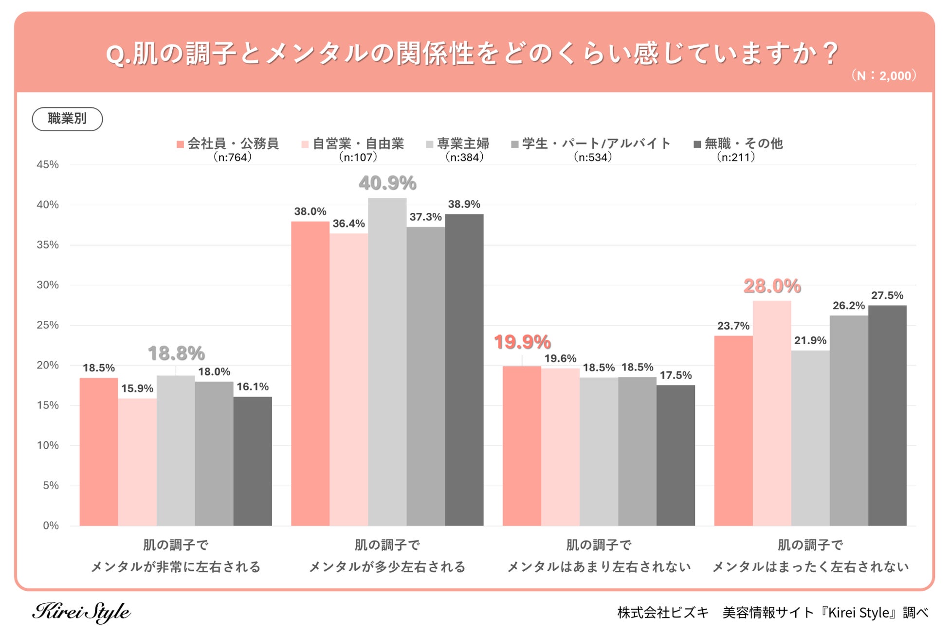 一方、「肌の調子でメンタルはまったく左右されない」という方は「自営業・自由業」で最も回答率が高くなり、28.0%となりました。組織内で働く方と比べ、働く時間や場所、人間関係を自分で調整できる自由度が高い分、精神的な余裕を持ちやすいということなのかもしれません。