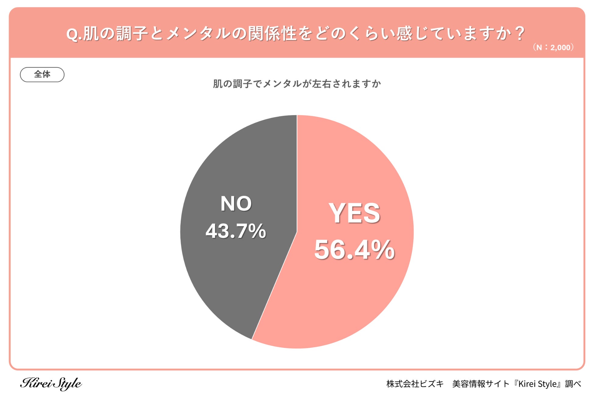 全国の20代~50代の女性2,000人を対象に、「肌の調子とメンタルの関係性をどのくらい感じていますか?」というアンケート調査を実施したところ、肌の調子でメンタルが「左右される」という方は56.4%、「左右されない」という方は43.7%という結果になりました。
