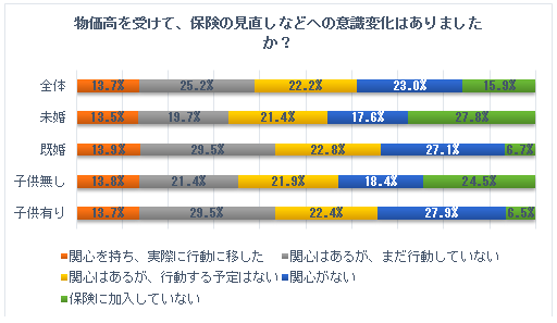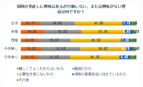 未婚の人と比べて既婚の人の方が、また、子供がいない人と比べて子供がいる人の方が、保険の見直しについて「関心がない」と回答した割合が高く、結婚や出産というライフステージが変わるタイミングでしっかりと検討したうえで保険に加入している人が多いのかもしれません。