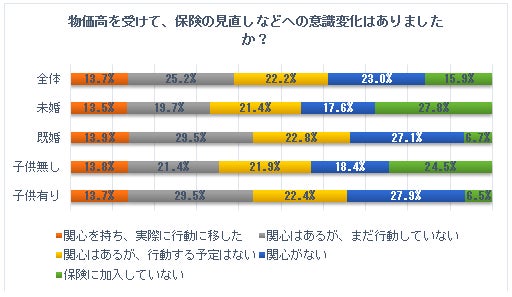 物価高の中、家計の負担となる固定費ですが、最近の物価高を受けて保険の見直しを行った人は13.7%に留まりました。また、45.2%の人は、保険の見直しについて「関心はあるが、行動する予定はない」または「関心がない」との回答でした。