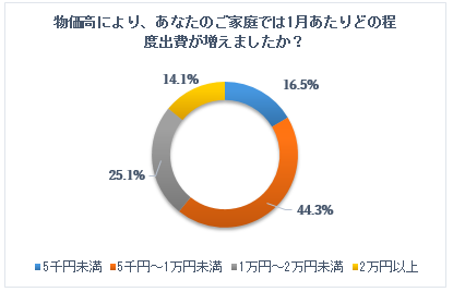 物価高による出費の増え幅としては、1か月当たり5千円〜1万円未満が44.3%と最も多い回答でしたが、1万円以上出費が増加していると回答した人も39.2%もおり、物価高による家計への圧迫がうかがえます。