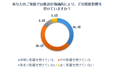 最近話題になっている物価高ですが、家計への影響について調査したところ、「非常に影響を受けている」「やや影響を受けている」と回答した人は合わせて84.7%にのぼり、多くの家計へ影響を与えているということがわかりました。
