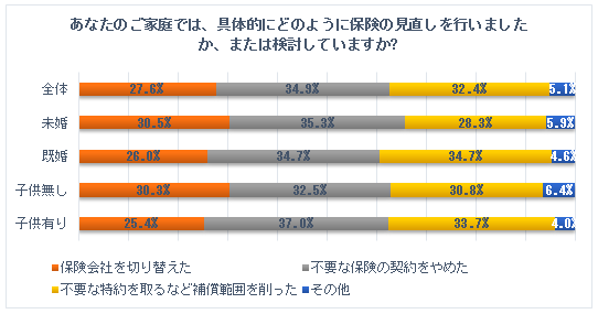 保険を見直す手段としては、「不要な保険契約をやめた」や「不要な特約を取るなど保障範囲を削った」という方が多く、それらに比べると保険会社自体を見直す人は少ないようです。