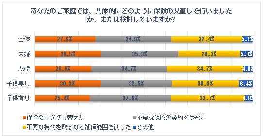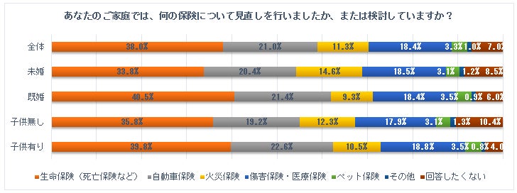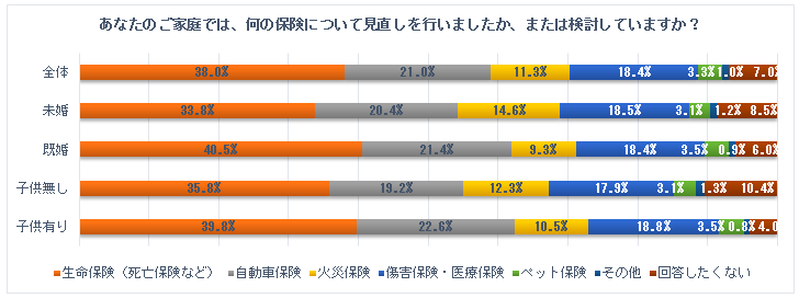 保険の見直しを実際に行った人、または検討している人に何の保険を見直したか伺ったところ、生命保険が約4割を占める結果となりました。この結果は、未・既婚、子供有無の属性に関わらず、同様の傾向が現れています。