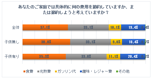 なお、子供がいない家庭と比較して、子供がいる家庭では「ガソリン代」や「趣味・レジャー費」を節約している、または節約を検討している割合が高く、休日の家族の楽しみが制限されているのかもしれません。