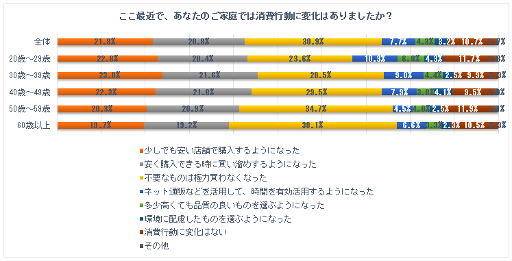 最近の消費行動の変化については、「少しでも安い店舗で購入するようになった」「安く購入できる時に買い溜めするようになった」「不要なものは極力買わなくなった」など、節約に繋がる行動が全年代共通して多く見られます。