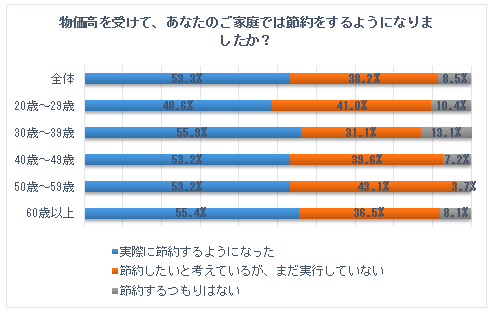 物価高により、91.5%の人は「実際に節約している」または「まだ実行していないものの節約を検討している」との回答でした。特に、30代以上の人は半数以上が実際に節約しているとの回答であり、実際に消費行動を変化させていることがわかりました。