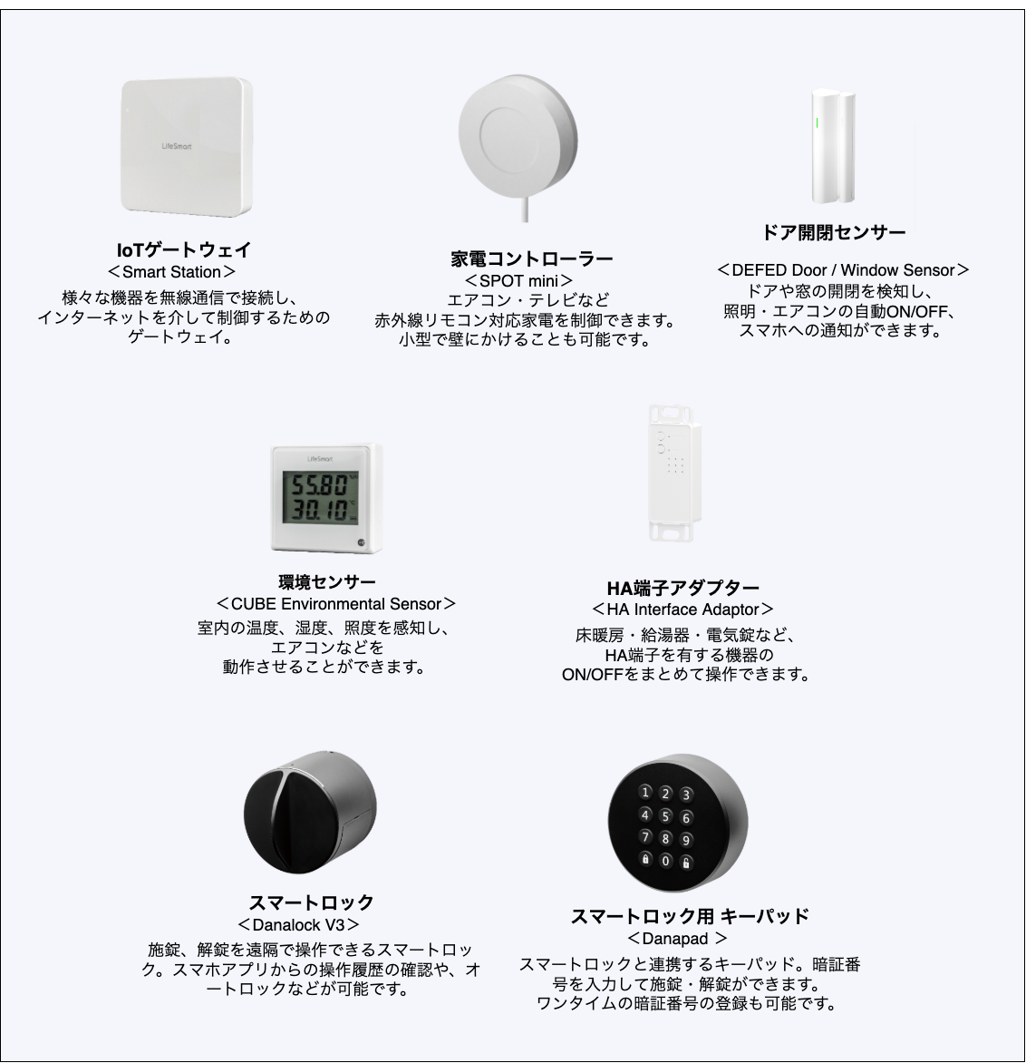 「Warren KoyoⅠ」に導入された「SpaceCore」のスマートホームデバイスは、次の7種類となります。