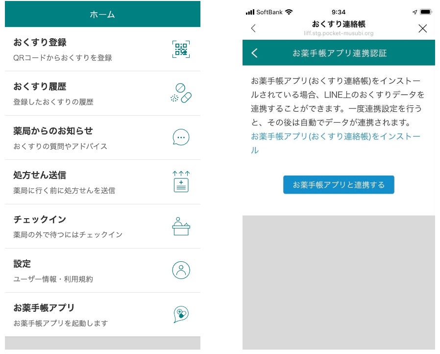 Pocket Musubiホーム画面の設定から、お薬手帳アプリ「おくすり連絡帳」との連携を選択して利用