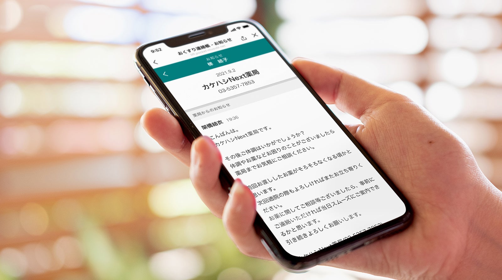 薬局と患者さんをつなぐおくすり連絡帳「Pocket Musubi」は、患者さんに「またこの薬局に行きたい」と感じていただけるような薬局体験を提供するための、LINE経由で利用できる患者フォローシステムです。