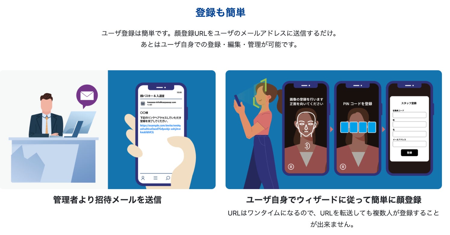 入室管理を始めるには、権限管理者がメールでユーザーを招待します。メールには顔登録用のURLが記載されており、ユーザーはURLから顔登録を行います。権限管理者は、扉ごとに入室できるユーザーを管理することで、ユーザーが入室できる範囲を設定することが可能です。入室権限が付与されていない部屋に関しては、顔認証を行っても解錠されません。