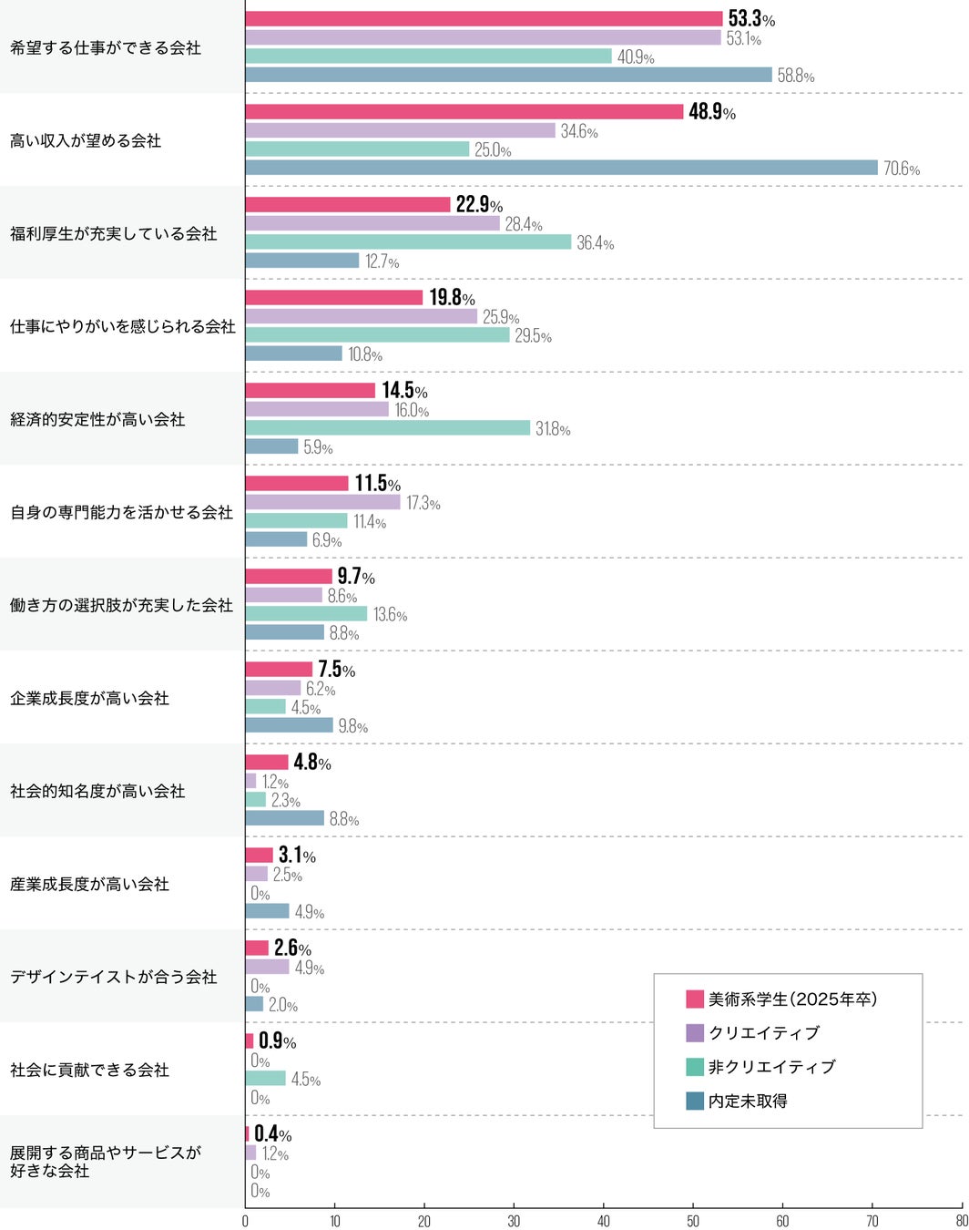 このような変化から、美術系学生は引き続き仕事内容へのこだわりを強く持っていることが伺えます。