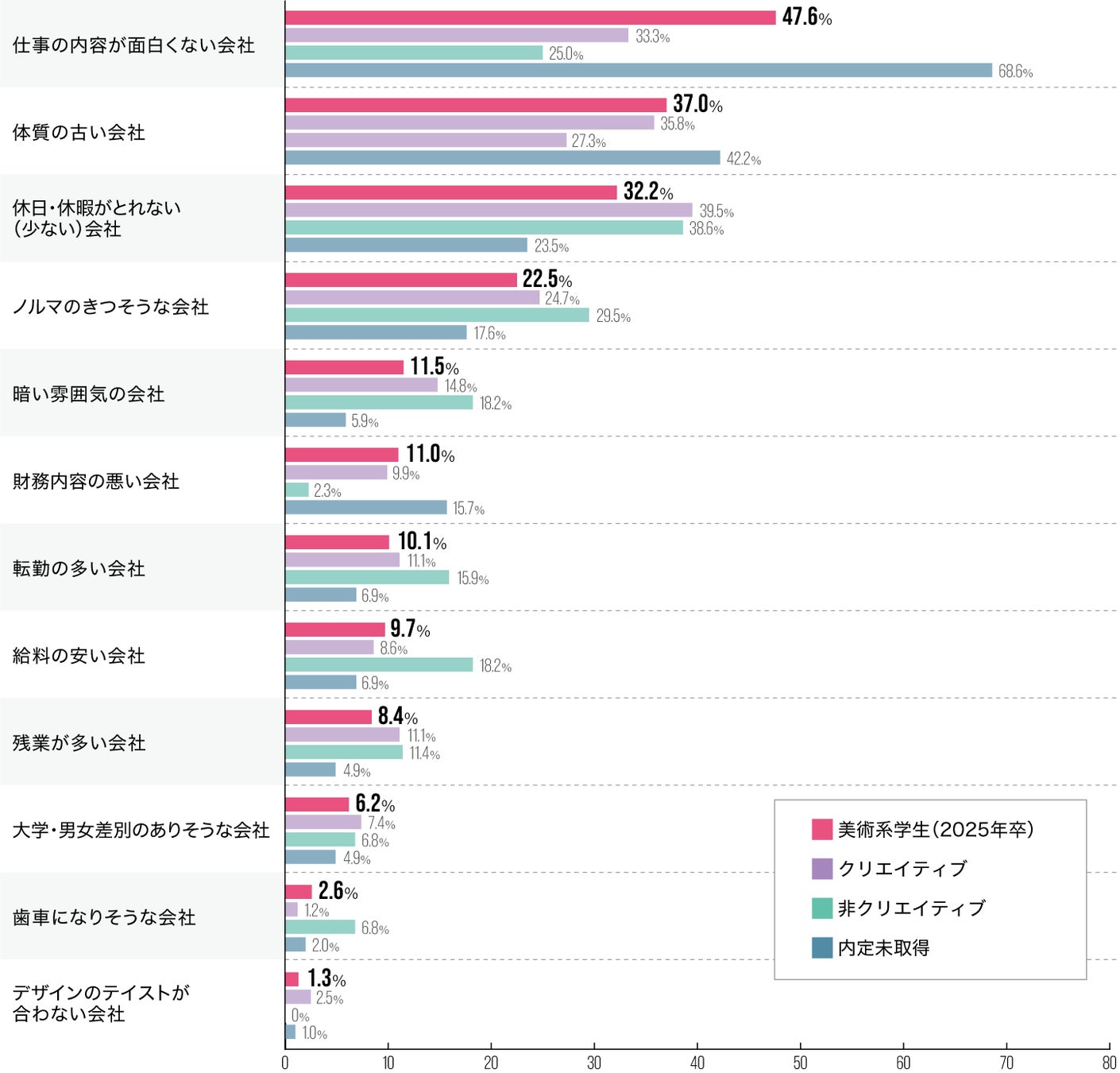合わせて確認したいのは、25年卒美術系学生の「行きたくない会社」(2個選択)の回答結果です。