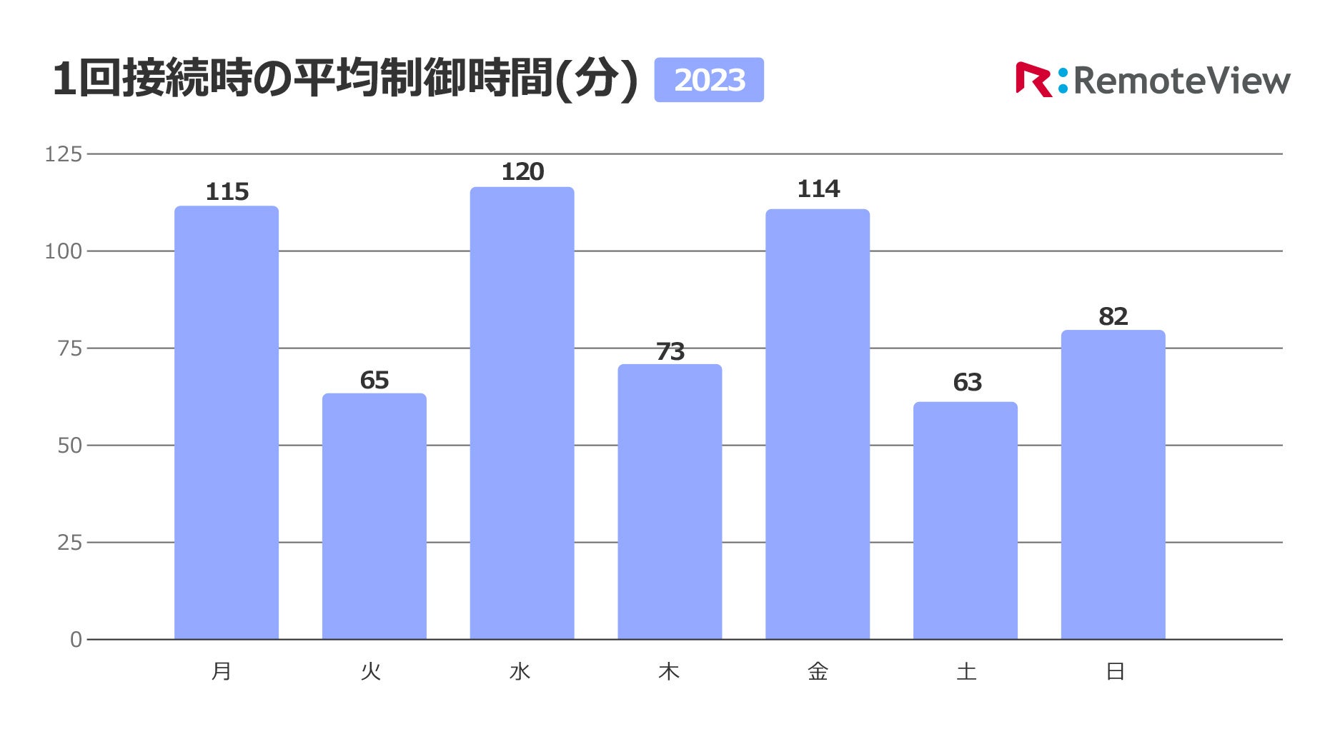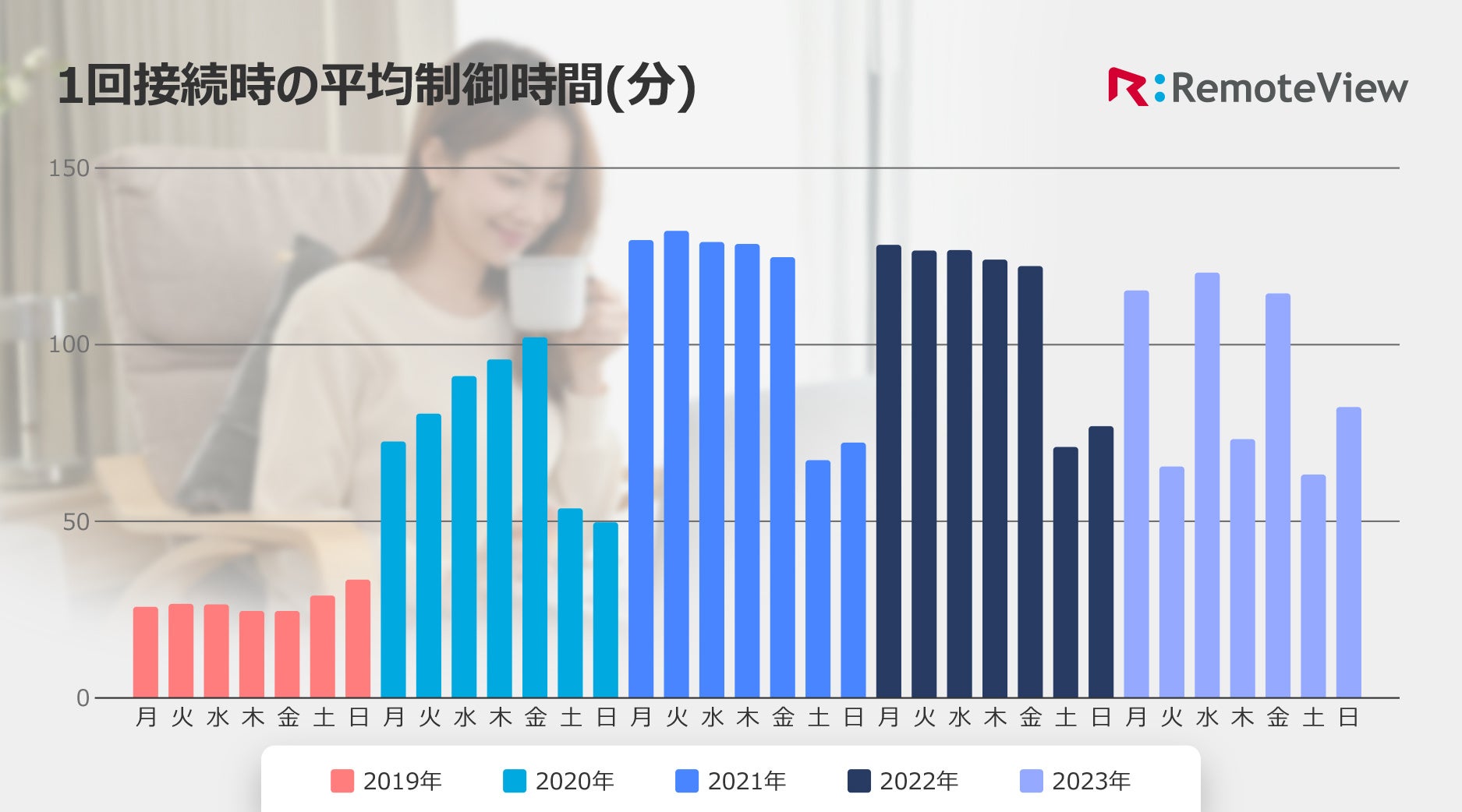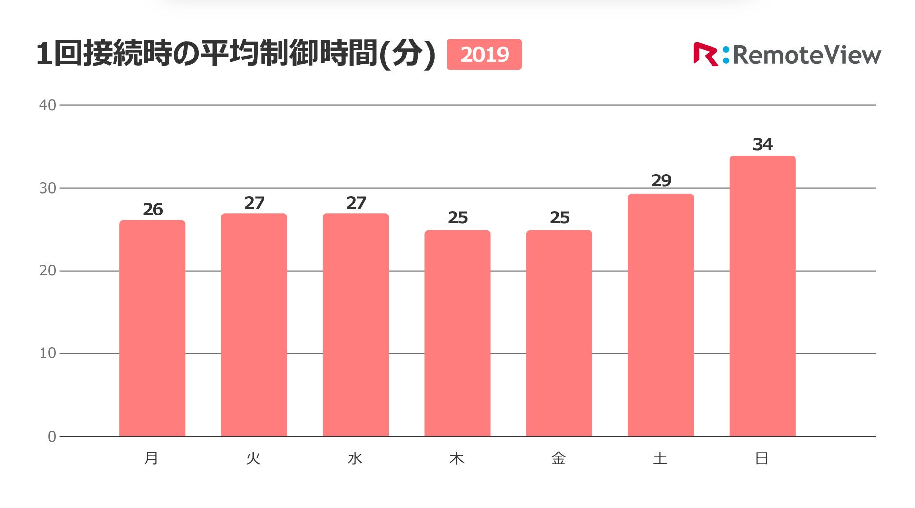 新型コロナウイルス感染症が広く流行する前の2019年。曜日ごとの1回接続時の平均遠隔制御時間を見てみると、月曜日から金曜日の平均利用時間は約30分未満であることが分かります。オフィスにある遠隔先の端末へつなげて継続的に業務を行う利用スタイルよりは、外出先や自宅などからスポットで接続し、資料確認や社内システムを確認する形と見られます。