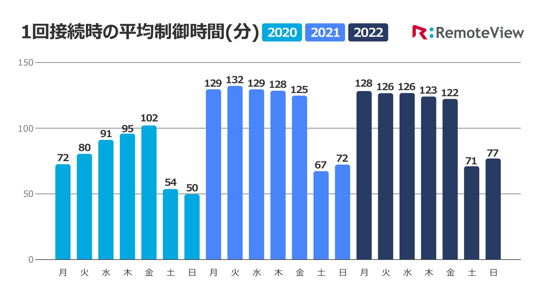 その後、2019年末より新型コロナウイルスの感染が拡大し、初めて緊急事態宣言が出された2020年から新型コロナウイルス感染症が深刻化した2022年の3年間。この期間の平均利用時間をみると、2020年は2019年度の利用時間よりも倍となり、平日の1回の接続あたりの利用時間が週末の利用時間より明らかに長くなり、平日に日常的かつ継続的にリモートアクセスにて業務がおこなわれていることが分かります。