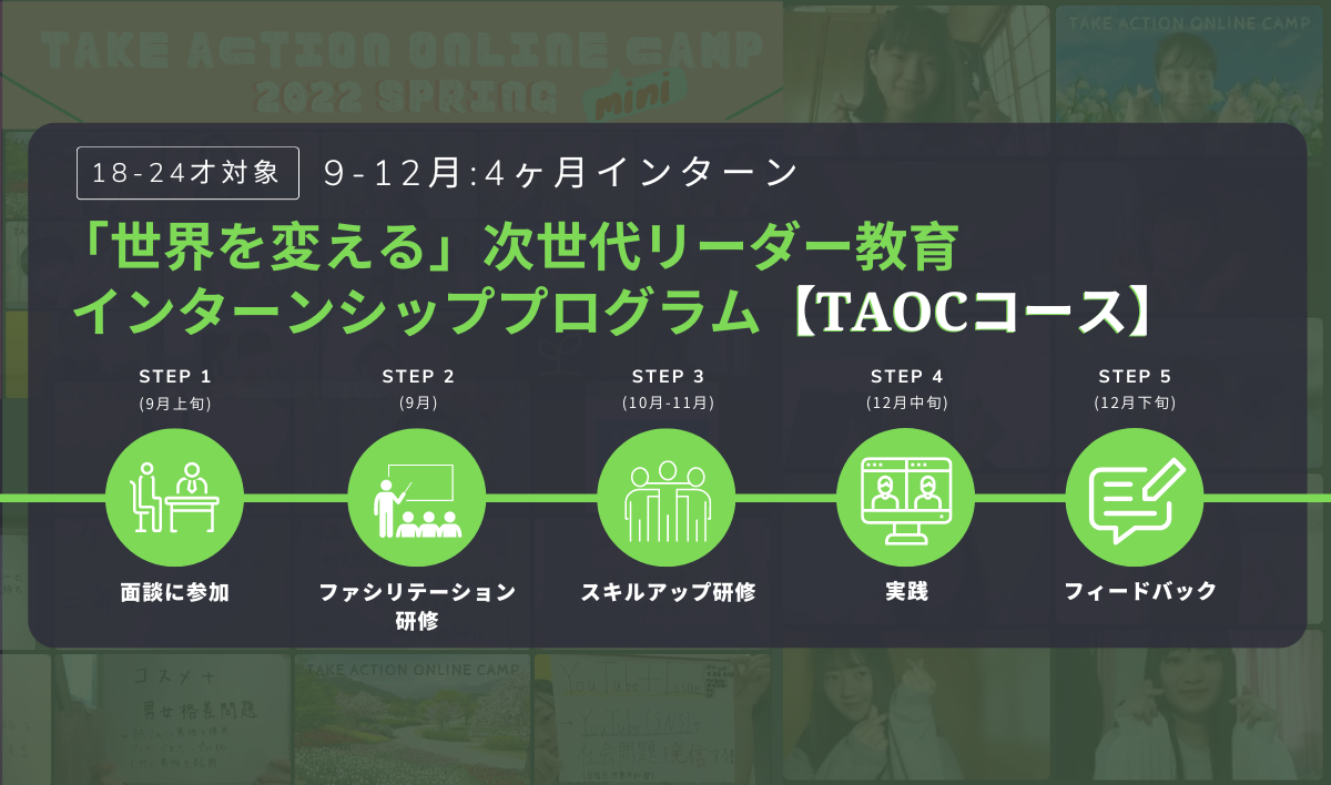 認定NPO法⼈フリー・ザ・チルドレン・ジャパン(所在地:東京都世⽥⾕区南烏⼭6-6-5-3F、代表:中島早苗)は、18歳~24歳を対象にした無料オンライン研修「次世代リーダー教育インターンシッププログラム」参加者の募集を開始しました。当団体が実施している数日間にわたる小中高校生向けオンラインキャンプ「テイク・アクション・オンライン・キャンプ(TAOC)」でのファシリテーション担当を担うコースと、社会問題についてプレゼンやディスカッションなどを行うオンラインイベント「WE Talk "SOCIAL"(WTS)」の企画・運営を目指すコースの2コースで募集します。