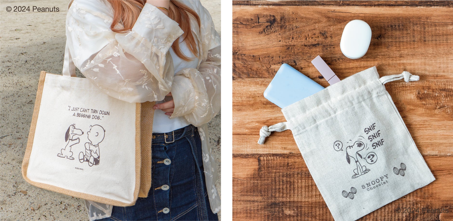 夏のコーディネートにぴったりなジュート素材のバッグは、体に当たる部分はキャンバス生地で、服が傷む心配がありません。顔をくしゃくしゃにしておねだりするスヌーピーが愛おしいデザイン。