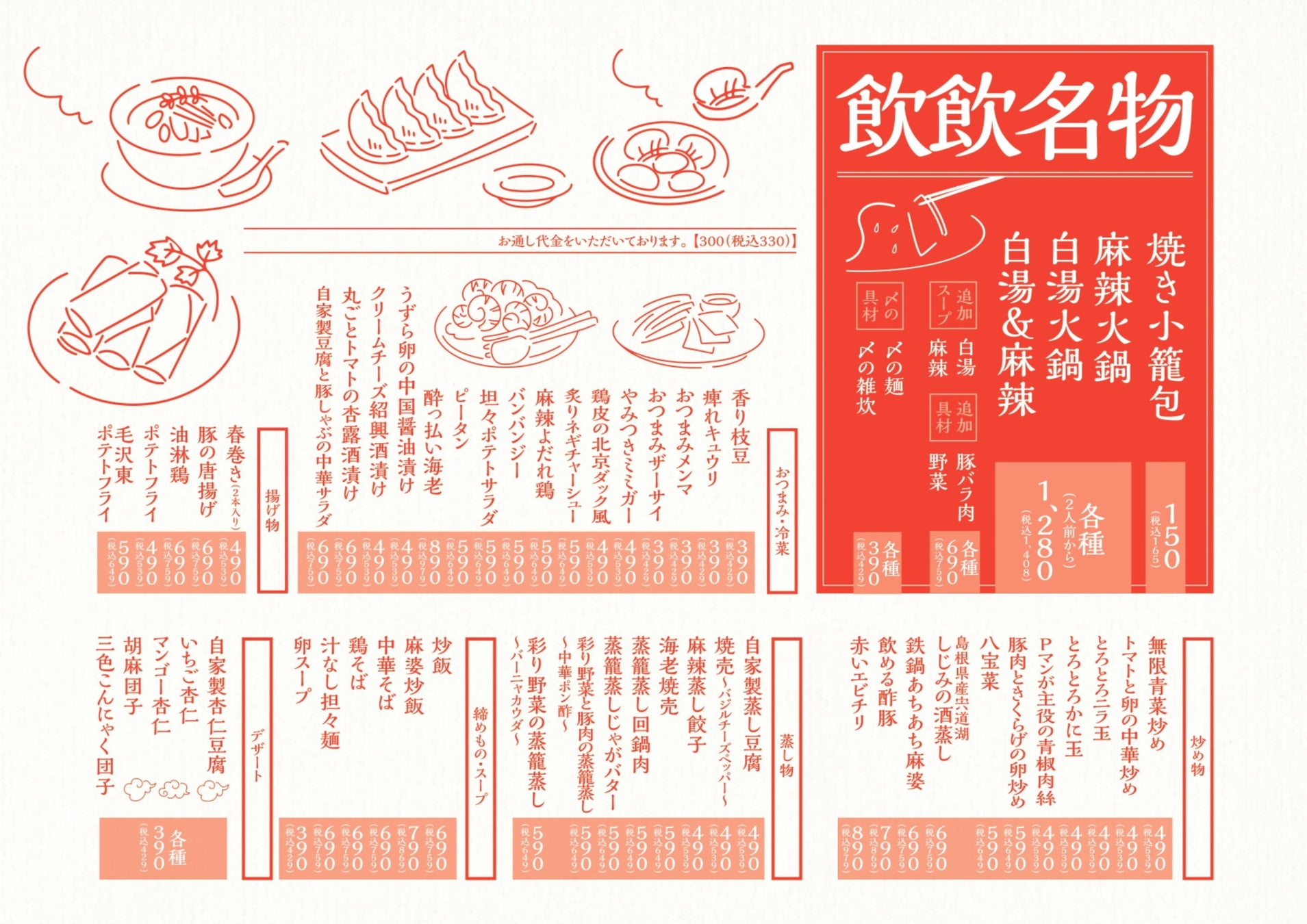 当店自慢の焼き小籠包は、ジューシーな肉汁がたっぷり詰まった逸品。1個150円(税込165円)というリーズナブルな価格でご提供し、何度でも楽しめます。火鍋は白湯と麻辣の2種類のスープから選べ、豊富な具材と共に楽しめます。特におすすめは、店独自のスパイスブレンドで煮込んだ麻辣スープです。