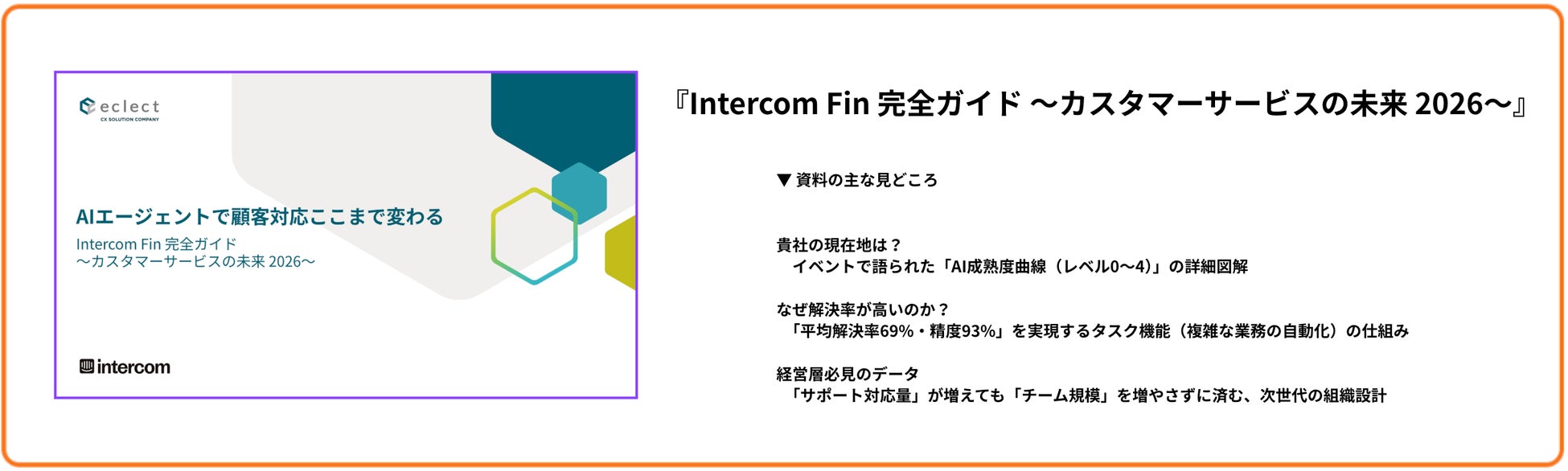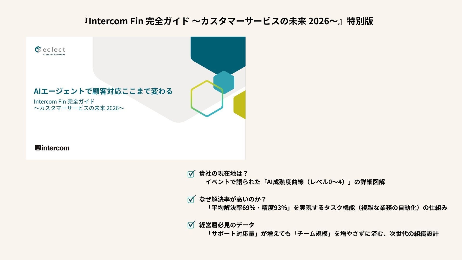 本イベントで大きな反響を呼んだ、AIエージェント「Fin」の全体像と具体的なビジネスインパクトをまとめた特別資料『Intercom Fin 完全ガイド 〜カスタマーサービスの未来 2026〜』を、本レポート記事を読まれた企業様、AIエージェント導入をご検討中の企業様向けに、特別に無料配布しています。