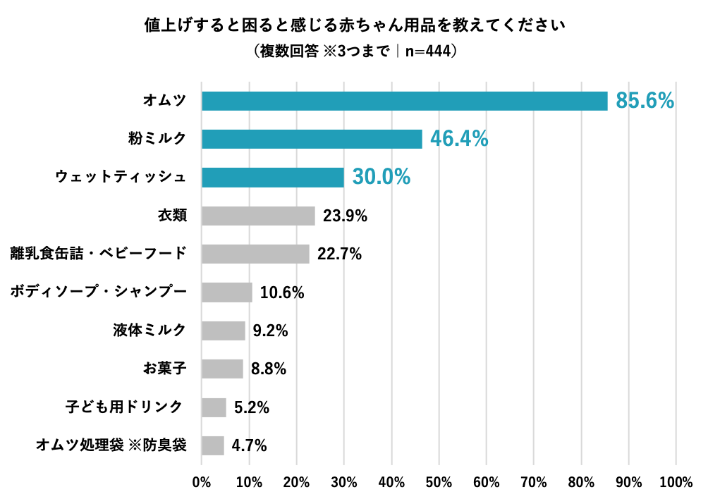 0歳・1歳の子どもがいる女性444人に、値上げすると困る赤ちゃん用品は何かと質問したところ、TOP3は1位「オムツ」(85.6%)2位「粉ミルク」(46.4%)3位「ウェットティッシュ」(30%)となりました。