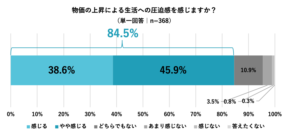 物価の上昇を「感じる」「やや感じる」を回答した368人に、物価の上昇による生活への圧迫感を質問したところ、38.6%が「感じる」、45.9%が「やや感じる」と回答。合わせて84.5%が物価の上昇による生活への圧迫感を感じていることがわかりました。