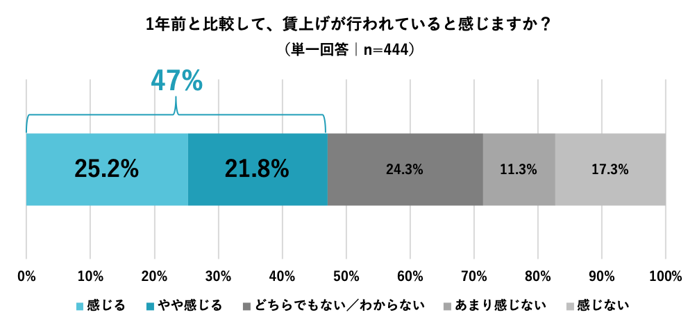 同じく、1年前と比較して、賃上げが行われていると思うかを質問したところ、25.2%が「感じる」、21.8%が「やや感じる」となり、合わせて47%が、賃上げを実感していると回答しました。