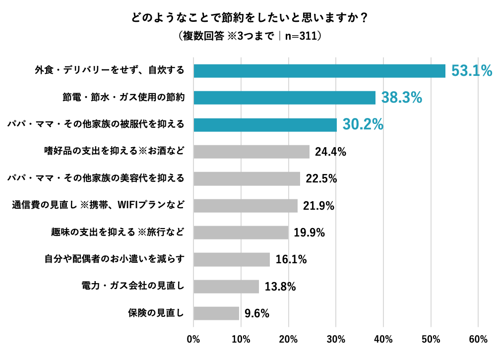 物価の上昇による生活への圧迫感を「感じる」「やや感じる」と回答した311人に、どのような節約を実施したいかと質問したところ、TOP3は1位「外食・デリバリーをせず自炊する」(53.1%)2位「節電・節水・ガス使用の節約」(38.3%)3位「パパ・ママ・その他家族の服代を抑える」(30.2%)となりました。