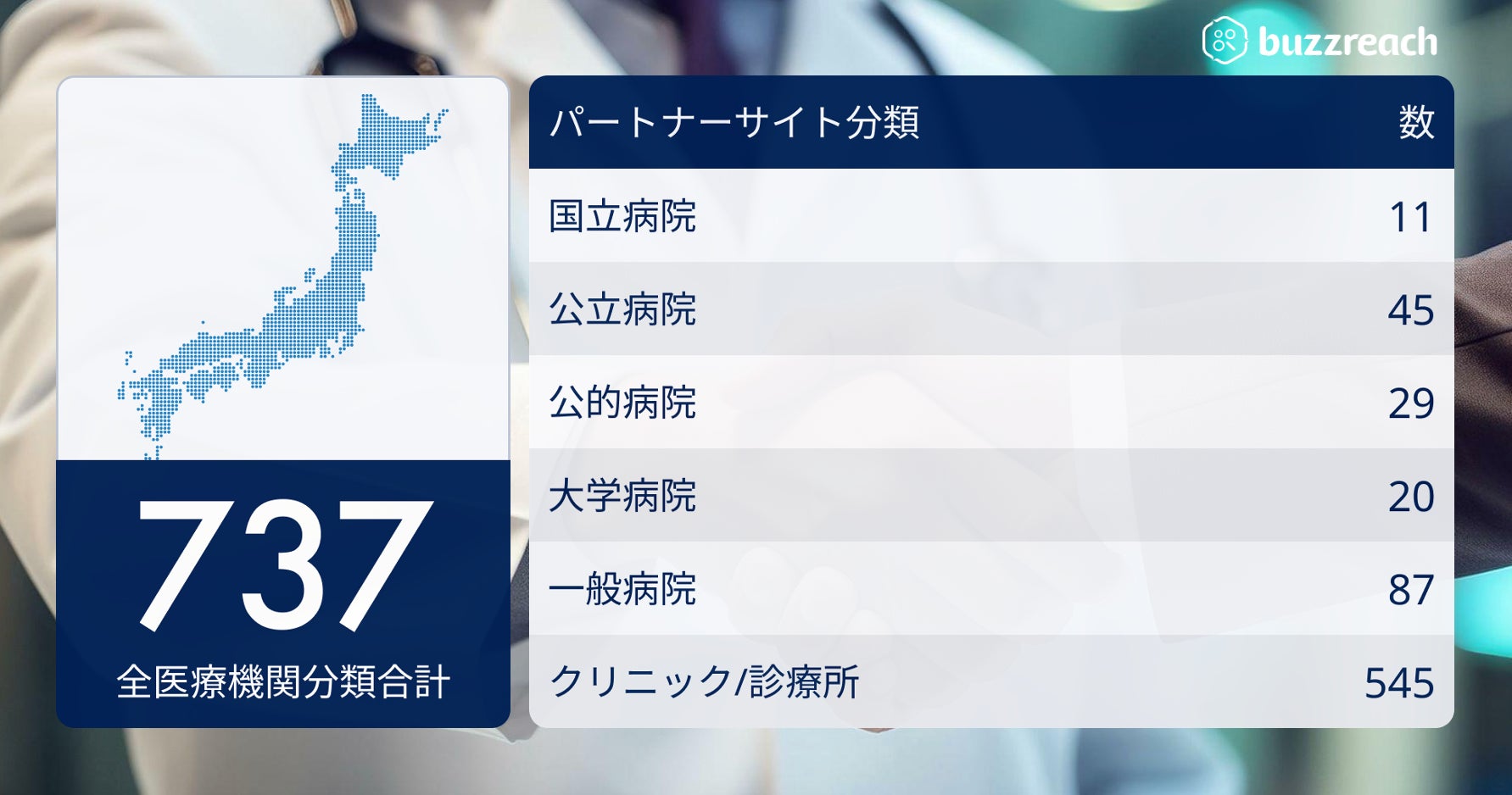 株式会社Buzzreach(本社:東京都港区、代表取締役CEO:猪川崇輝)は、全国の医療機関と連携し治験参加患者の紹介や治験実施医療機関からの委託による一部治験業務を支援する「パートナーサイト」スキームにおいて、2025年5月時点で契約実績が29疾患、737施設に到達いたしました。
