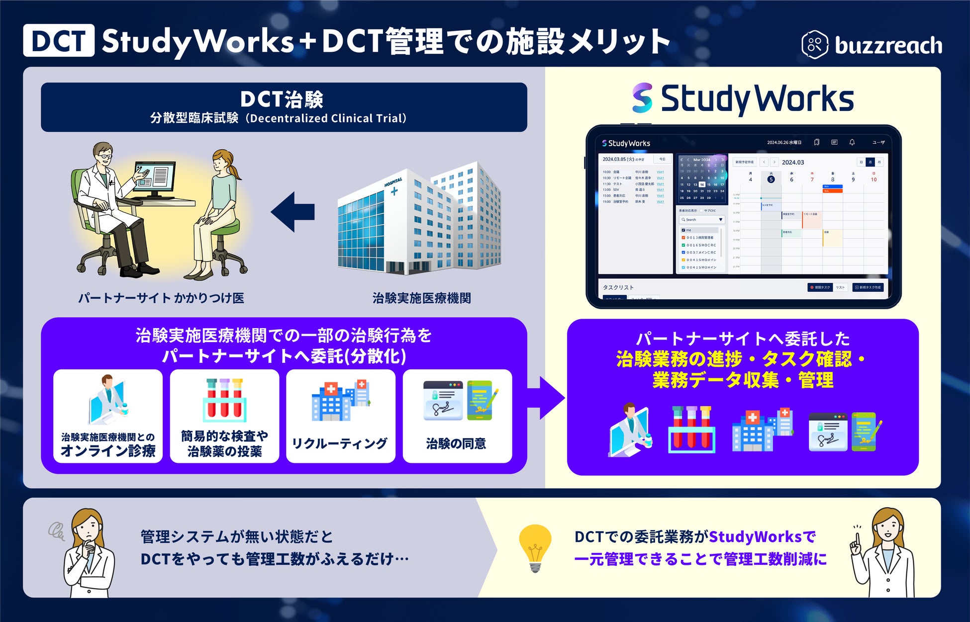 政府のDCT推進の流れもありGCP※の規制緩和に伴い、パートナーサイトに委託できる治験業務がリクルーティングの支援(eリクルート)に始まり、治験の同意(eコンセント)、治験の診療支援(Visit対応やオンライン診療、訪問看護等)など委託業務が増加していく中で、治験実施医療機関側としては、それらの委託業務の内容を把握(GCP省令39条の2の範囲での管理監督責任)をする必要があります。これまではそれぞれのDCT業務をバラバラに管理する必要があり治験実施医療機関側には逆に負担が増加し、DCT推進とは真逆の環境が懸念されていました。 このような課題を払拭するため、DCT業務管理を一元管理できる機能の提供を当社の治験実施医療機関向けの治験業務管理プラットフォームである『StudyWorks』に追加機能して夏頃より一部提供を開始します。