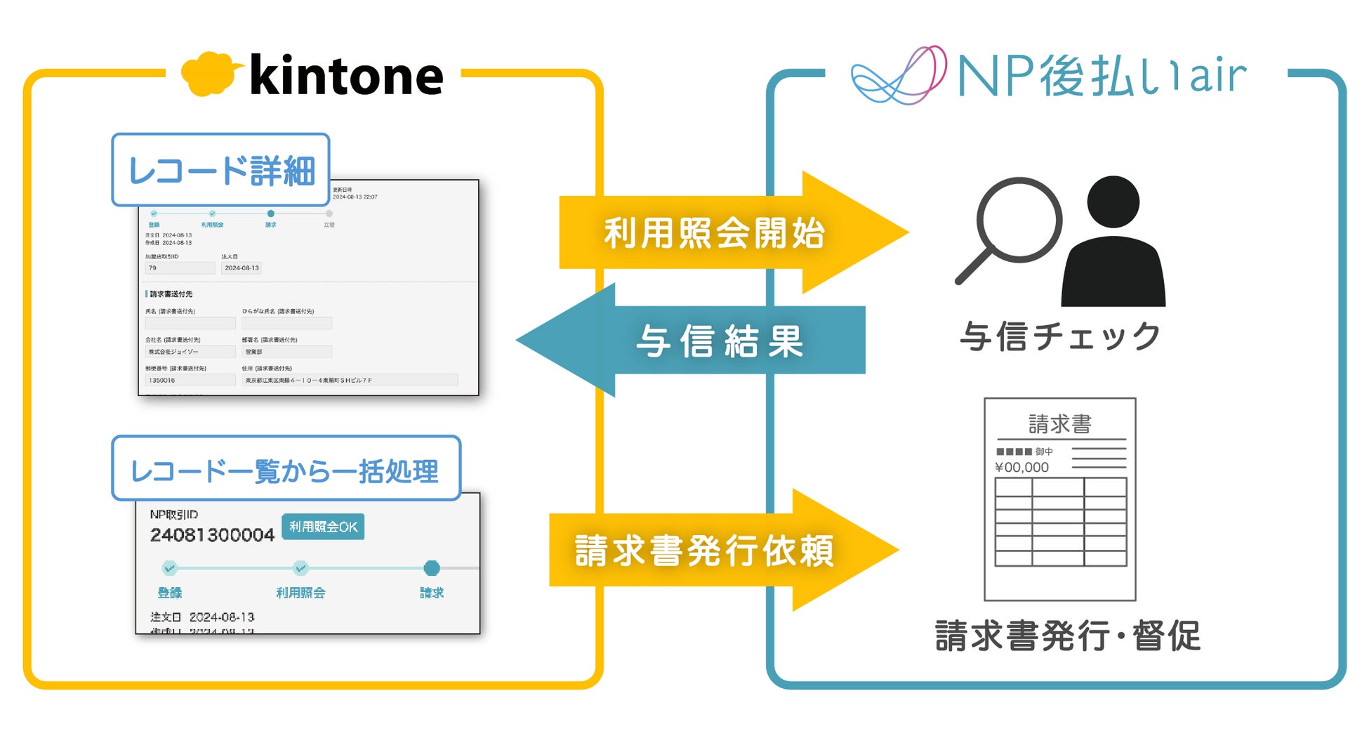 「NP後払いair for kintone」のご利用には、弊社が開発した「NP後払いair連携プラグイン」のご契約が必要となります。「NP後払いair連携プラグイン」は、「kintone」の情報を「NP後払いair」へリアルタイムに連携するプラグインです。