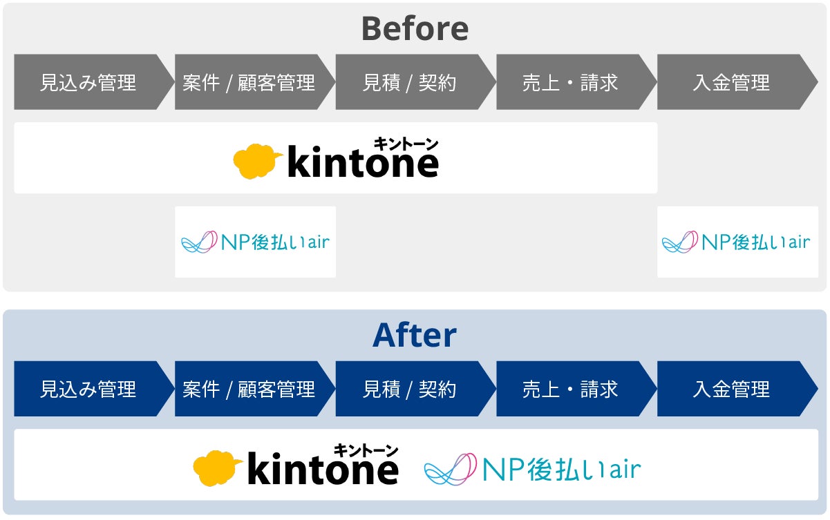 今回、株式会社ネットプロテクションズが提供を開始する「NP後払いair for kintone」によって、顧客・案件管理から請求業務まで「kintone」上で一元管理することができるようになり、バックオフィス業務の効率が向上します。