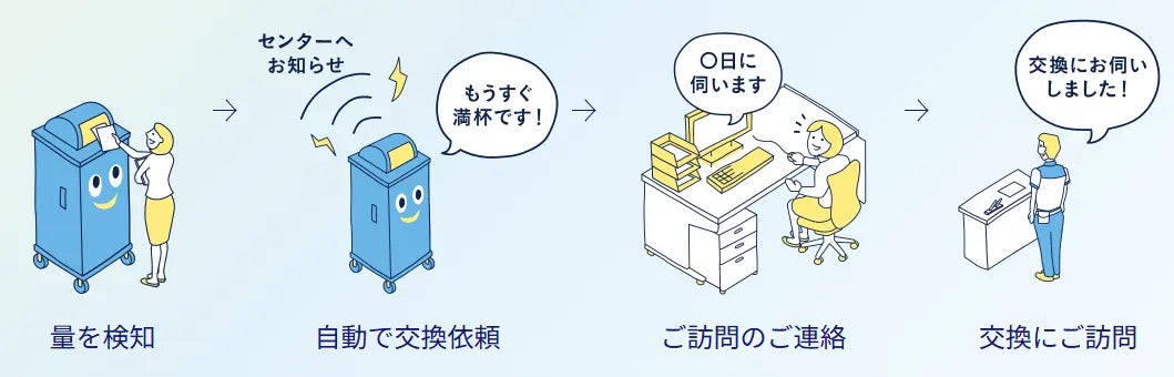 自動検知・自動依頼:ボックス内部に搭載されたIoTセンサーが文書量をリアルタイムで検知。満杯になる前にシステムが自動で回収依頼をセンターへ送信します。