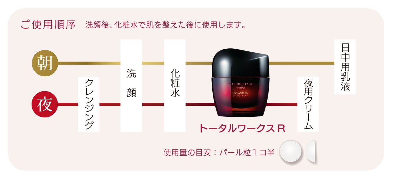 4代目のトータルワークスとなる『トータルワークス R』のコンセプトは、「積み重ねた時間に挑む〔Reプログラム〕」。年齢を重ねた大人の肌を見つめてきたトータルワークスが、さらに深く、全方位なアプローチへ。ひとつ上のうるおい、ハリ・弾力を目指して、新たなステージへと挑みます。
