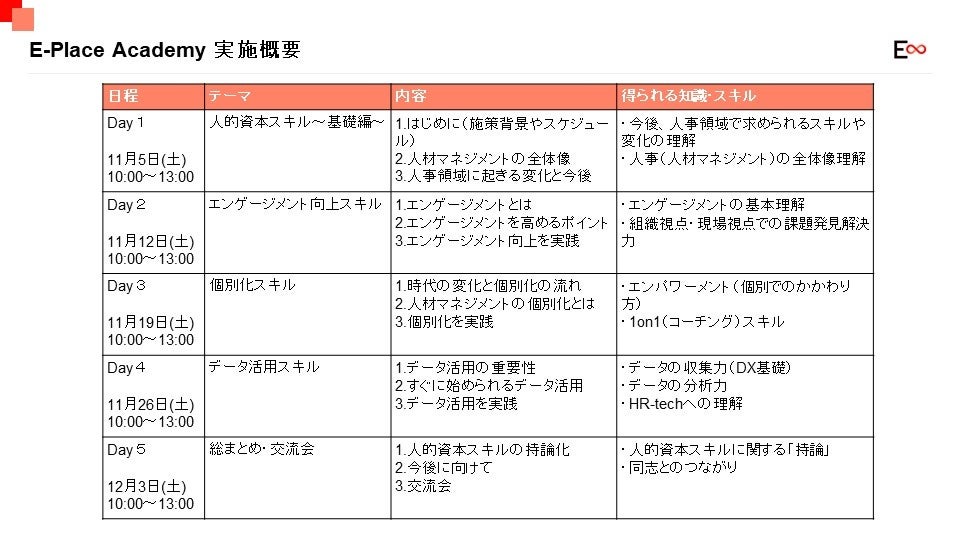 エンゲージメント向上を軸とした組織開発・人材育成コンサルティング支援を行う株式会社NEWONE(本社:東京都千代田区 代表取締役:上林周平、https://new-one.co.jp/ 以下、NEWONE)は、NEWONE発の学生コミュニティ「E-Place(イープレイス)」にて、日本初(※)の『学生向け人事・人材育成スクール』を2022年11月5日、12日、19日、26日、12月3日の土曜日の午前中、全五回で開催いたします。
