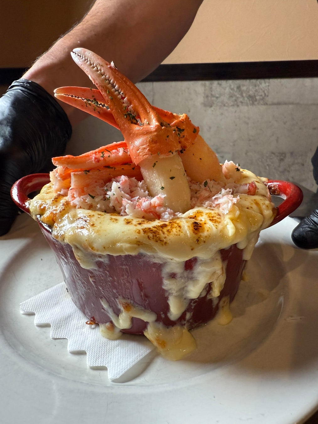 カニボナーラはチーズをたっぷりのせた特製カルボナーラを鍋ごとこんがり焼きあげ、上にズワイガニの身を贅沢にトッピングして仕上げたボリューム満点の一品!
