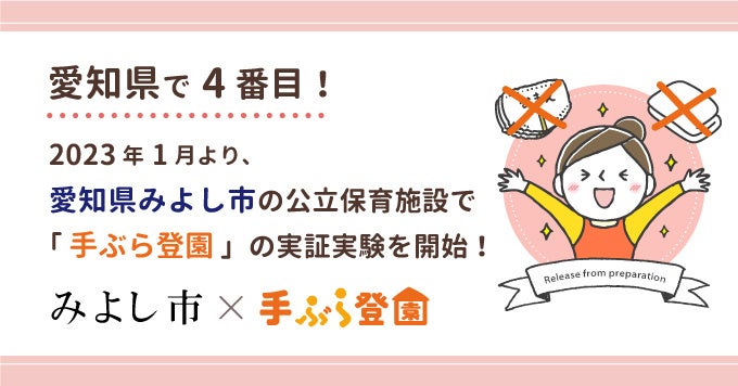 BABY JOB株式会社(本社:大阪府大阪市、以下当社)は、愛知県みよし市の公立保育施設において、当社とユニ・チャーム株式会社が提供する、保育施設向け紙おむつの定額サービス「手ぶら登園」の実証実験を、2023年1月より2か月間実施することをお知らせします。愛知県内の公立保育施設では、豊橋市、半田市、豊田市に続いて4番目の実証実験になります。