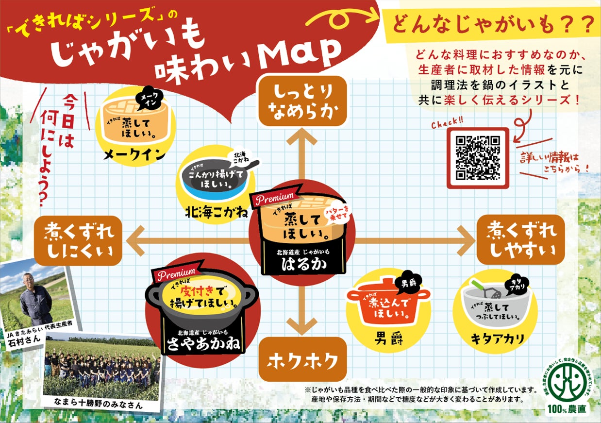 ⽣活者がスーパーでじゃがいもを選ぶ時に悩んでいることは「じゃがいもの品種名だけ書いてあってもどんな料理におすすめなのかわからない」という点です。この悩みを解決するため、「できればシリーズ」は生まれました。