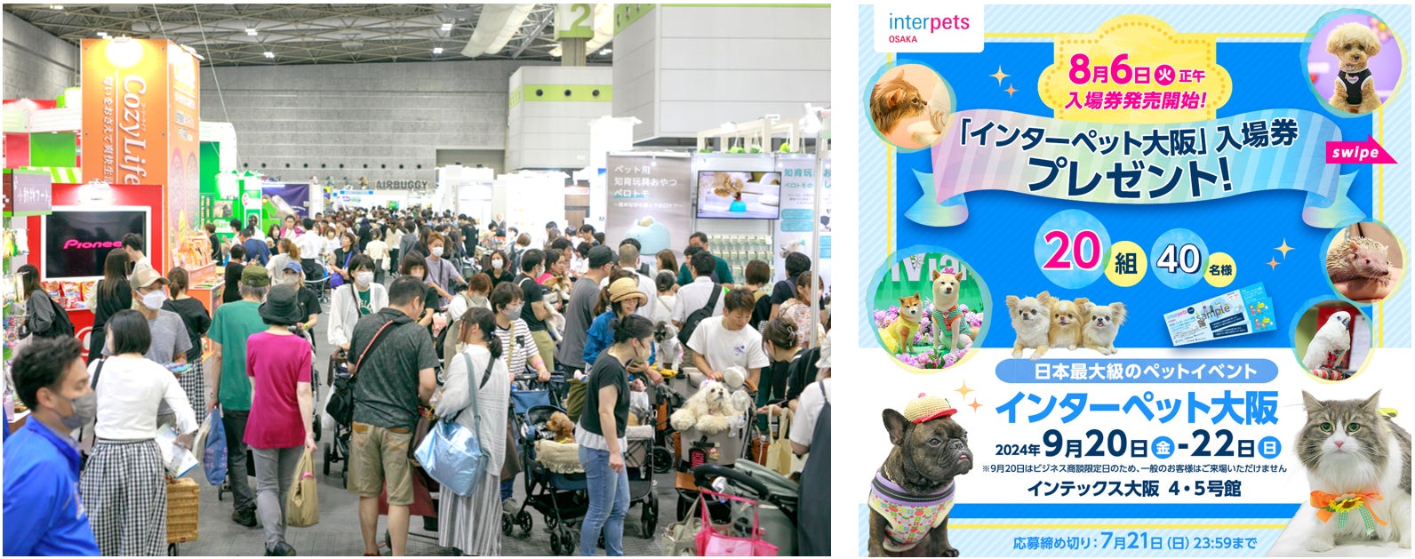 日本最大級のペットイベント「インターペット ~人とペットの豊かな暮らしフェア~」の姉妹見本市「インターペット大阪」は、2024年8月6日(火)正午から、一般来場者を対象とした入場券の販売を開始します。今回から入場券を3種類に増やし、1日入場券(1,500円)、13時入場券(900円)、15時入場券(500円)が、プレイガイドKKdayから購入できます。「インターペット大阪」は「人とペットの豊かな暮らしを提案する」をコンセプトに、さまざまなペット製品やサービスを国内外から集結させたペット産業見本市として、また、ペットと一緒に来場できるペットイベントとして9月20日(金)-22日(日)、インテックス大阪4・5号館で開催します。初開催の2023年は、9カ国・地域から258社(国内229社、海外29社)が出展し、3日間で14,508名と5,461頭のペットが来場しました。2024年は11カ国・地域から約300社の出展を予定しています(2024.7月現在)。