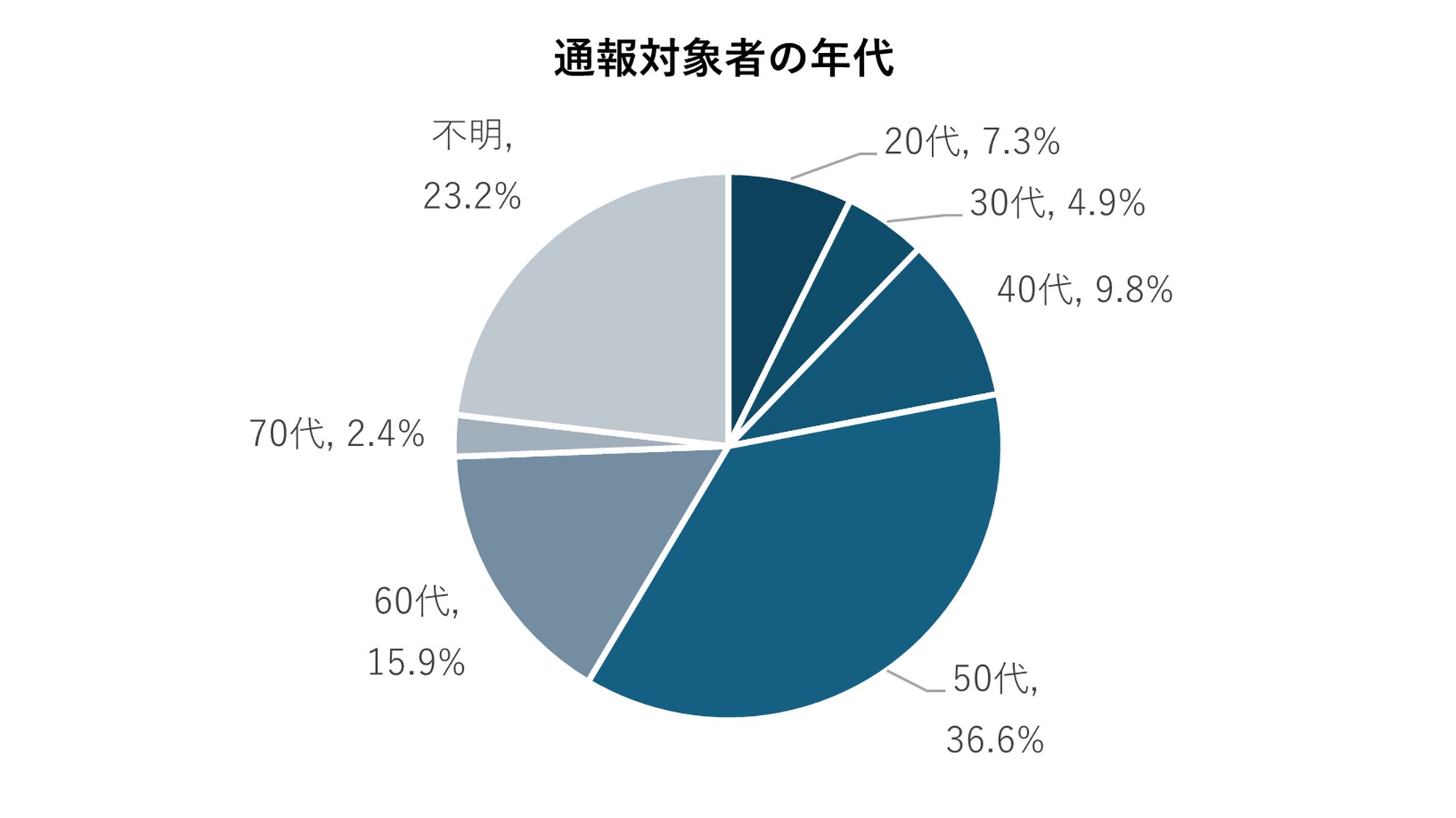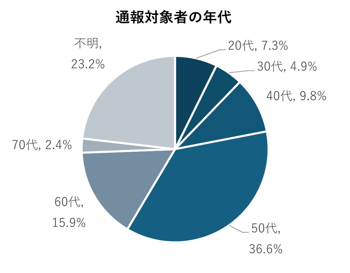 通報対象者の年代は、最多が50代で約37%、次いで60代で約16%と、この2つの年代で半数超を占める結果となりました。