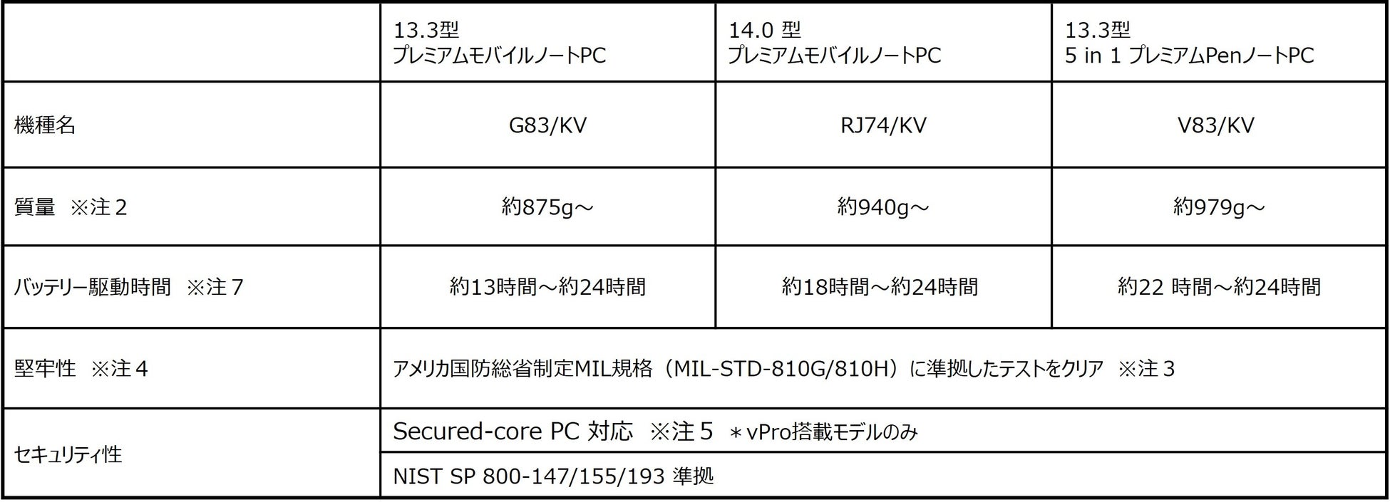 また、いずれも長時間バッテリー駆動と1kg以下の軽量さ※注2で抜群のモビリティ性能を実現。さらに、設計段階から行われている徹底したシミュレーションと厳しい製品テストに加え、過酷なことで知られるアメリカ国防総省制定MIL規格(MIL-STD-810G/810H)に準拠したテストをクリア※注3しているため、薄型・軽量のモバイルPCとして、安心して持ち歩くことができ、長く使い続けられる堅牢性※注4を実現しました。